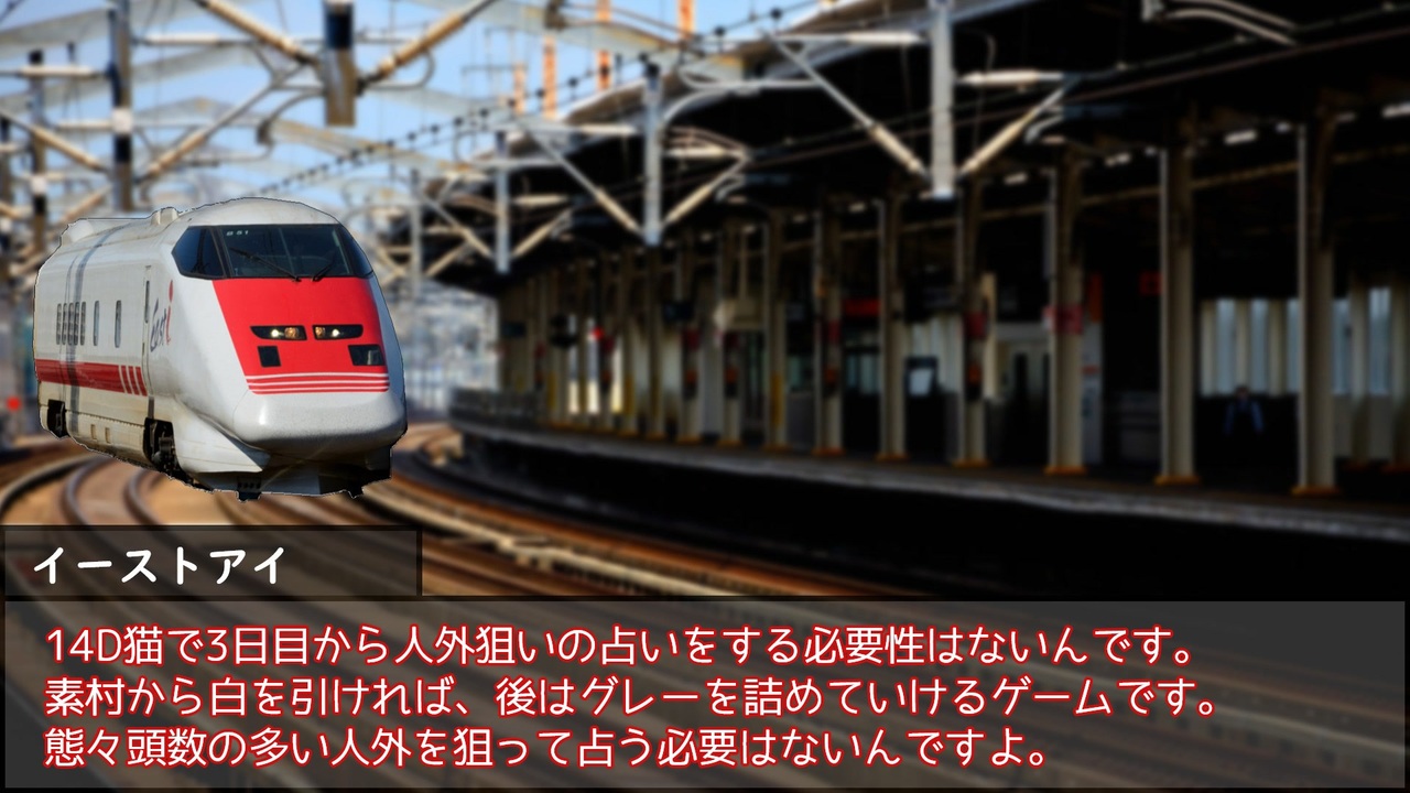 この時期恒例の鉄シールに300系(弊村のこだまくん)がいたので、<br>アクキー込みでキッチリ引きました。<br>俺は300系のブラインドだけは強い…!<br><br>E6系とイーストアイの余命宣告が来ましたね。<br>悔いがないように撮影しておかないと!<br><br>14D猫:村2/占1/霊1/狩1/猫1/共2/狼3/信1/狐1/背1<br><br>2日目:<a href="https://www.nicovideo.jp/watch/sm45441550" class="watch">sm45441550</a> 4日目:<a href="https://www.nicovideo.jp/watch/sm45639872" class="watch">sm45639872</a> 11月中に<br><br>Twitterで考察して頂ける方は『#電車で人狼』を入れて呟いていただけると探しやすいです。<br>擬人化関連のFAは『#鉄擬で人狼』を入れて頂けると助かります。<br>(既に投稿されたものはそのままで大丈夫ですよ!)<br><br>電車で人狼!マイリスト <a href="https://www.nicovideo.jp/mylist/72946958" target="_blank" rel="noopener">mylist/72946958</a><br>電車で人狼! 支線編(解説動画) <a href="https://www.nicovideo.jp/mylist/79077747" target="_blank" rel="noopener">mylist/79077747</a><br>人狼動物園マイリスト <a href="https://www.nicovideo.jp/mylist/72986089" target="_blank" rel="noopener">mylist/72986089</a><br><br><br><a target="_blank" href="https://qa.nicovideo.jp/faq/show/19424?site_domain=default" style="font-size: 13px;color: #657586; text-decoration: underline; line-height: 1.4">この動画は投稿者によって修正されました</a>