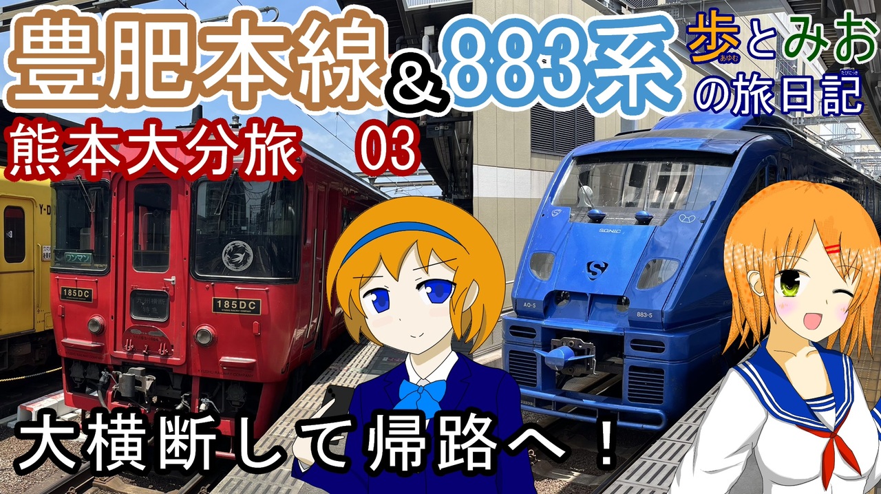 丹下琴絵様(<a href="https://www.nicovideo.jp/user/87444894" target="_blank" rel="noopener">user/87444894</a>)主催のくまもと動画投稿祭(<a href="https://www.nicovideo.jp/watch/sm44739650" class="watch">sm44739650</a>)の参加動画3作目となります。<br><br>豊肥本線に乗る予定は当初なかったのですが、A列車で行こうが運行日でないため大分へ行くことになりました。<br><br>どうか無事に打ち上げ配信で配信されますように…w<br><br><br>【使用BGM】<br>DOVA-SYNDROME<br><a href="https://dova-s.jp" target="_blank" rel="noopener nofollow">https://dova-s.jp</a><br>騒音のない世界<br><a href="https://noiselessworld.net/sm43685799" target="_blank" rel="noopener nofollow">https://noiselessworld.net/sm43685799</a><br>【効果音】<br>効果音ラボ<br><a href="https://soundeffect-lab.info" target="_blank" rel="noopener nofollow">https://soundeffect-lab.info</a><br>【キャラクター提供】<br>かしみや<br>(<a href="https://www.nicovideo.jp/user/74514002" target="_blank" rel="noopener">user/74514002</a>)<br>【出演】<br>西谷歩 CV:花隈千冬( CeVIO AI)<br>戸田みお CV:小春六花( CeVIO AI)<br>奥楓 CV:春日部つむぎ(VOICEVOX)<br>市川そばこ(うp主 ) CV:四国めたん(VOICEVOX)<br><br>【エンディング】<br>「朝焼けのキセキ」<br>作詞・作曲・編曲:Atelier ladybird(川崎泰弘、吉村彰一)<br>
