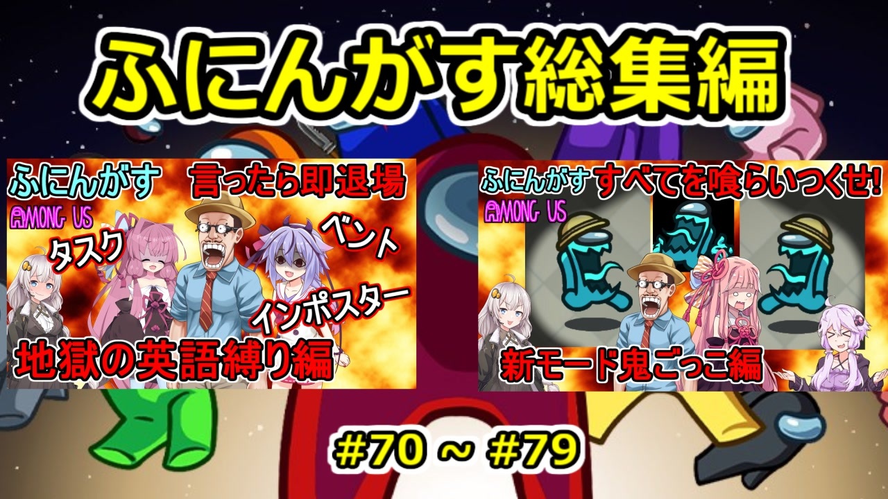 <a href="#" class="seekTime" data-seekTime="00:00" onclick="seekNicoPlayer('#00:00'); return false;">#00:00</a> #70 英語・横文字使ったら即退場!:地獄の英語縛り編<br><a href="#" class="seekTime" data-seekTime="08:28" onclick="seekNicoPlayer('#08:28'); return false;">#08:28</a> #71 追い詰められた女王は誰に頼るのか!?:幸運で不憫な女王編<br><a href="#" class="seekTime" data-seekTime="13:48" onclick="seekNicoPlayer('#13:48'); return false;">#13:48</a> #72 今ここに俺が来なかった!?マップがダミーだらけに!:VSダミーインポスター編<br><a href="#" class="seekTime" data-seekTime="23:42" onclick="seekNicoPlayer('#23:42'); return false;">#23:42</a> #73 船員全員にウイルスをばら撒け!:感染拡大アンブレイヤー編<br><a href="#" class="seekTime" data-seekTime="36:23" onclick="seekNicoPlayer('#36:23'); return false;">#36:23</a> #74 獄の英語縛り再来!?妙楽さんスペシャル民主主義ルール:神に翻弄されるミッショナリー編<br><a href="#" class="seekTime" data-seekTime="44:57" onclick="seekNicoPlayer('#44:57'); return false;">#44:57</a> #75 引き寄せる不運!船内にあふれるダミー!:ふびんがすEX<br><a href="#" class="seekTime" data-seekTime="53:10" onclick="seekNicoPlayer('#53:10'); return false;">#53:10</a> #76 アモアスでサッカー!?ボールは友達!:ふにんがすサッカー編<br><a href="#" class="seekTime" data-seekTime="57:27" onclick="seekNicoPlayer('#57:27'); return false;">#57:27</a> #77 起死回生の茜ちゃん!すべてを破壊し尽くせ!:偽りの爆弾魔編<br><a href="#" class="seekTime" data-seekTime="01:05" onclick="seekNicoPlayer('#01:05'); return false;">#01:05</a>:49 #78 ニコニコ本社に乗り込んできたぜ!:ニコニコイベントでの戦い編<br><a href="#" class="seekTime" data-seekTime="01:12" onclick="seekNicoPlayer('#01:12'); return false;">#01:12</a>:11 #79 公式追加の鬼ごっこ!最後まで生き残れ!:新モード鬼ごっこ編<br><br>ボイロ・CeVIO実況者をメインとした宇宙人狼ゲーム「Among Us」の大規模コラボの「ふにんがす」<br>その凪尾視点の動画の総集編<br>#70 ~ # 79 となっています<br>一部シーンは都合によりカットしています<br>理由は元動画と比較したうえで察してください<br><br>YouTube高画質版:<a href="https://youtu.be/JZrcyzIBNE0" target="_blank" rel="noopener nofollow">https://youtu.be/JZrcyzIBNE0</a><br><br>Twitter:<a href="https://twitter.com/naoreisen" target="_blank" rel="noopener nofollow">https://twitter.com/naoreisen</a><br> <br>前回 ふにんがすガンダムファイブボンバーPart2:<a href="https://www.nicovideo.jp/watch/sm45346561" class="watch">sm45346561</a><br>前回 ふにんがす:AmongUs:奇跡のギャンブラー編:<a href="https://www.nicovideo.jp/watch/sm45328403" class="watch">sm45328403</a><br>前回 GTA5:カオス磯野モード:地獄研究所前編:<a href="https://www.nicovideo.jp/watch/sm45316442" class="watch">sm45316442</a><br>前回 パーティアニマルズ:イタズラ妨害狸編:<a href="https://www.nicovideo.jp/watch/sm45113701" class="watch">sm45113701</a><br>前回 凪尾クラフト:トライアルチャンバー編:<a href="https://www.nicovideo.jp/watch/sm44573824" class="watch">sm44573824</a><br>前回 猫ミームブラック企業動画:<a href="https://www.nicovideo.jp/watch/sm43364794" class="watch">sm43364794</a><br>前回 GTA動画:KICK BACK PV再現:<a href="https://www.nicovideo.jp/watch/sm41527305" class="watch">sm41527305</a><br><br />ふにんがす動画マイリスト <a href="https://www.nicovideo.jp/mylist/71314393" target="_blank" rel="noopener">mylist/71314393</a><br>GTA5手配度MAXシリーズ <a href="https://www.nicovideo.jp/mylist/18374381" target="_blank" rel="noopener">mylist/18374381</a><br><br>【凪尾マイクラ等サーバー参加方法】<br>ニコニコ凪尾チャンネル・クリエイターサポート加入者・NicoFTパス所持者 YouTubeメンバーシップゴールド以上の方々が参加できます! 分からないことがあったら気軽に質問してください!<br>ニコニコチャンネル<br><a href="https://ch.nicovideo.jp/nagio-gta?ref=pc_mypage_top" target="_blank" rel="noopener nofollow">https://ch.nicovideo.jp/nagio-gta?ref=pc_mypage_top</a><br>※会員限定動画はニコニコチャンネル加入者・YouTubeメンバーシップノーマル以上から視聴できます。<br><br>■超会議2025グッズ通販(pixivBooth)<br><a href="https://nagio-gta25252.booth.pm/" target="_blank" rel="noopener nofollow">https://nagio-gta25252.booth.pm/</a><br>■ずんだもん立ち絵公開しました<br><a href="http://nico.ms/im10892141" target="_blank" rel="noopener nofollow">http://nico.ms/im10892141</a><br>■琴葉姉妹立ち絵公開しました<br><a href="https://seiga.nicovideo.jp/seiga/im10803182" target="_blank" rel="noopener nofollow">https://seiga.nicovideo.jp/seiga/im10803182</a><br><br>楽曲提供:ぺんぺんさん:<a href="https://www.nicovideo.jp/user/93911302" target="_blank" rel="noopener">user/93911302</a><br>ふにちかさん作凪尾立ち絵:<a href="https://seiga.nicovideo.jp/seiga/im10956602?nicorepotwitter_upload_illust" target="_blank" rel="noopener nofollow">https://seiga.nicovideo.jp/seiga/im10956602?nicorepotwitter_upload_illust</a><br><br>▼以下配信活動ページ:よかったら登録してね!<br>ニコ生<br><a href="https://www.nicovideo.jp/user/2620730/live_programs?ref=pc_userpage_menu" target="_blank" rel="noopener nofollow">https://www.nicovideo.jp/user/2620730/live_programs?ref=pc_userpage_menu</a><br>YouTubeiS4mQ7q8w?sub_confirmation=1<br>Twitch:<a href="https://www.twitch.tv/nagiogames" target="_blank" rel="noopener nofollow">https://www.twitch.tv/nagiogames</a><br>ツイキャス:<a href="https://twitcasting.tv/g:106250988999788152314" target="