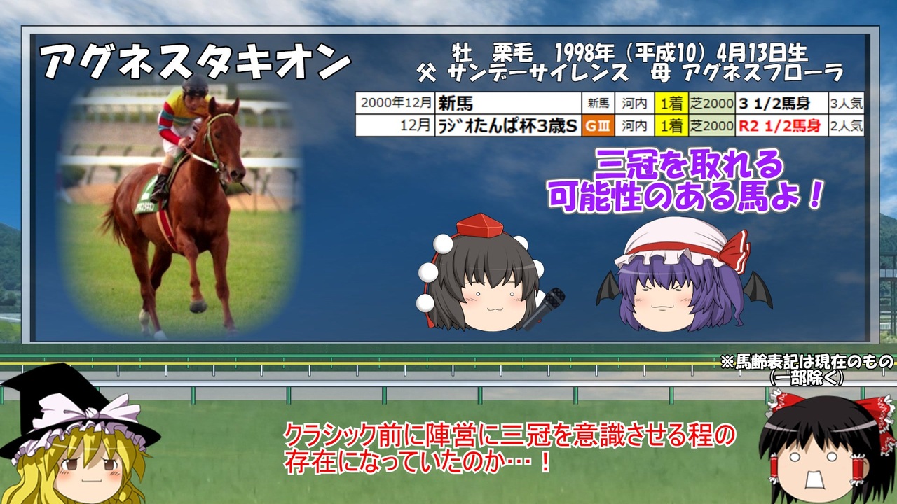 /前作m45394168 次 牝馬シリーズマイリス<a href="https://www.nicovideo.jp/mylist/65869255" target="_blank" rel="noopener">mylist/65869255</a> 競馬解説マイリス<a href="https://www.nicovideo.jp/mylist/64207040" target="_blank" rel="noopener">mylist/64207040</a> <br><br>つべ<a href="https://youtu.be/YFS05FRCfA4" target="_blank" rel="noopener nofollow">https://youtu.be/YFS05FRCfA4</a><br><br>名馬解説第55弾、アグネスタキオンです!<br>未だ世代最強の呼び声の高い幻の三冠馬。幻のライバル・アグネスゴールドも取り上げています。<br><br>BGM:甘茶の音楽工房様<br>画像提供元:TURF☆DUST 様(もがみますみ様)うまぽっと様 いらすとや様 きつねゆっくり様 ニコニコモンズ様<br>参考HP:優駿達の蹄跡様 Wikipedia JBISサーチ ピクシブ百科事典 ニコニコ大百科 JRA<br>