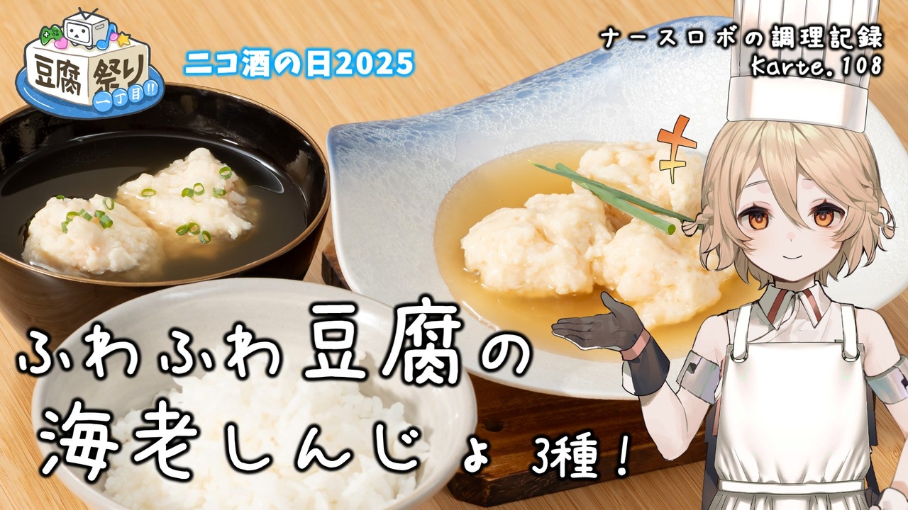 Part108は海老真薯!今回は豆腐入りバージョンです!<br>通常のものよりさっぱり目かつ、ふわふわに仕上がると思います!<br>お出汁が美味しいお料理ですので、是非美味しいお出汁で作ってみてください!<br>案外簡単かつアレンジの幅が広いので一度覚えると便利ですよ!<br>今回は3パターン紹介してます。<br><br>紹介している日本酒は白糸酒造さんの白糸55です。<br>とても美味しいので是非お試しください。<br><br>本動画は以下の投稿祭に参加しています<br>豆腐祭り 一丁目!!<br>主催: T.N.Chaos様<br>→<a href="https://www.nicovideo.jp/watch/sm44986799" target="_blank" rel="noopener nofollow">https://www.nicovideo.jp/watch/sm44986799</a><br><br>ニコ酒の日2025<br>主催: シロネコ様<br>→<a href="https://www.nicovideo.jp/watch/sm45237449" target="_blank" rel="noopener nofollow">https://www.nicovideo.jp/watch/sm45237449</a><br><br><br>音声: VOICEVOX:ナースロボ_タイプT<br>立ち絵: 捨て犬A<br>イラスト: いらすとや<br>SE: otologic, 効果音ラボ<br>BGM: BGMer<br /><br>[各種リンク]<br>ニコニコ動画: <a href="http://nicovideo.jp/user/130153578" target="_blank" rel="noopener nofollow">http://nicovideo.jp/user/130153578</a><br>YouTubeメイン(料理): <a href="http://youtube.com/@cooking25euph" target="_blank" rel="noopener nofollow">http://youtube.com/@cooking25euph</a><br>YouTubeサブ(料理以外): <a href="https://youtube.com/@sub25euph" target="_blank" rel="noopener nofollow">https://youtube.com/@sub25euph</a><br>X (twitter): <a href="https://twitter.com/nico25euph" target="_blank" rel="noopener nofollow">https://twitter.com/nico25euph</a><br>Bluesky: <a href="http://nico25euph.bsky.social" target="_blank" rel="noopener nofollow">http://nico25euph.bsky.social</a><br>TikTok: <a href="http://tiktok.com/@nico25euph" target="_blank" rel="noopener nofollow">http://tiktok.com/@nico25euph</a><br><br><a target="_blank" href="https://qa.nicovideo.jp/faq/show/19424?site_domain=default" style="font-size: 13px;color: #657586; text-decoration: underline; line-height: 1.4">この動画は投稿者によって修正されました</a>