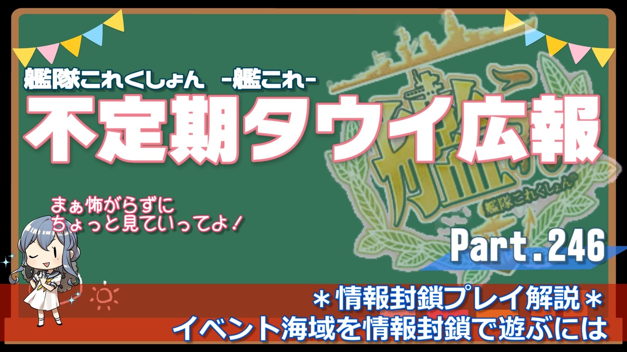 今回はイベント海域を情報封鎖で遊ぶときのアレコレです。<br>まあ、実態は私の経験談みたいなもので、解説と言いつつ大した内容ではありません。というか、作りながら思ったけど、かなり行き当たりばったりの脳筋プレイなんやなって…。<br><br>まあ、イベントを情報封鎖してる人がどういう風に遊んでいるかを少しでも伝えられたら幸いです。そんな感じでゆるくお付き合いくださいませ。<br><br>投稿時点の艦隊:<a href="https://tinyurl.com/2xotwper" target="_blank" rel="noopener nofollow">https://tinyurl.com/2xotwper</a><br><br>【タイムスタンプ】 <br><a href="#" class="seekTime" data-seekTime="00:00" onclick="seekNicoPlayer('#00:00'); return false;">#00:00</a> オープニング<br><a href="#" class="seekTime" data-seekTime="01:35" onclick="seekNicoPlayer('#01:35'); return false;">#01:35</a> 動画全体の流れ<br><a href="#" class="seekTime" data-seekTime="02:14" onclick="seekNicoPlayer('#02:14'); return false;">#02:14</a> 全体概要<br><a href="#" class="seekTime" data-seekTime="03:32" onclick="seekNicoPlayer('#03:32'); return false;">#03:32</a> 情報収集の着目点<br><a href="#" class="seekTime" data-seekTime="08:55" onclick="seekNicoPlayer('#08:55'); return false;">#08:55</a> 戦力配分の作り方<br><a href="#" class="seekTime" data-seekTime="15:14" onclick="seekNicoPlayer('#15:14'); return false;">#15:14</a> 海域情報の収集・工夫<br><a href="#" class="seekTime" data-seekTime="36:36" onclick="seekNicoPlayer('#36:36'); return false;">#36:36</a> 投稿者の戦績など<br><br><br>前回動画(Pt.245)をjo様、にゅにゅ様、伊野様、柳川様、ほうじcha様、Krytron様、ケケレ区民様、六頁管理人様、六本線様、yui@柱島様、風烈丸様、三流提督様、高町提督様、totokaka様、たぬきうどん様、コロマル様、さいぞう様、提督様、コパール様、kurausu様、湯月様、Habaki様、noaniPM様、SAM様、弥彦様、サルトル様、AKINO様、<(゜∀。)様、indy (indjpn)様、青あめしょー様、Hakamori様、神在月様、げん様、うたまる様、ガッツ様、おさしみ様、ATTI様、宵桜(ヨイザクラ)様、あらはばき様、叢雲提督様、ゆーきゅー様、あじ様、K-saku様、yotaka様、やはざま様、おさけ様、TK@幌筵様、ゆう様、gen様、アシュラ様から広告いただきました。ありがとうございます!<br><br>前:Part245> <a href="https://www.nicovideo.jp/watch/sm45263689" class="watch">sm45263689</a> 次:Part247> 秋イベ予想動画の予定<br><br>みちしおせんせい動画一覧:<a href="https://www.nicovideo.jp/mylist/63943551" target="_blank" rel="noopener">mylist/63943551</a><br>動画一覧:<a href="https://www.nicovideo.jp/mylist/45380440" target="_blank" rel="noopener">mylist/45380440</a><br>X:<a href="https://twitter.com/nekomaruta_tawi" target="_blank" rel="noopener nofollow">https://twitter.com/nekomaruta_tawi</a>