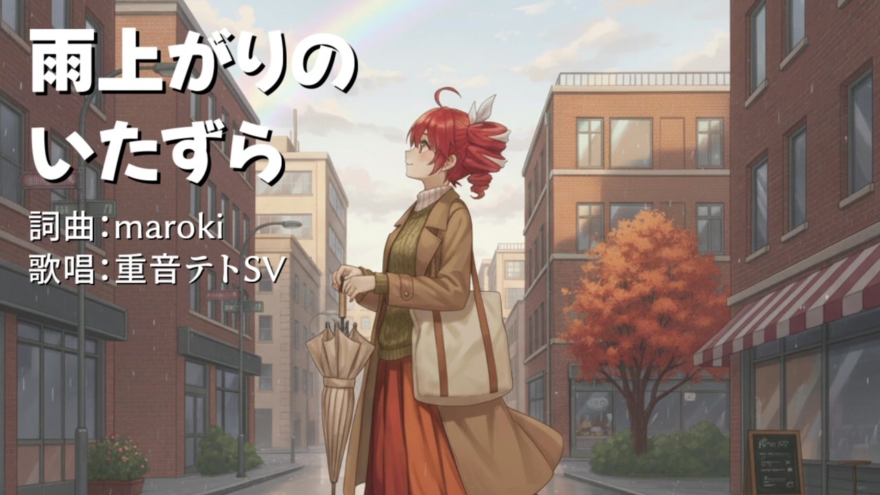 ■CROSS CULTURE RECORDS様ご主催「クロカル杯かわいい」に参加いたします!<br>■台風22号で閉じ込められている中、早く雨がやまないかなぁと考えながら一生懸命作りました!<br>■人が歌っても非常に気持ちよく歌え、またラストのサビは気づかないうちに全音上がっている構造にして、自然と盛り上がる感じにしています! よろしくお願いします!<br><br>(歌詞)<br><br>降りそぼった雨も七色になって<br>折りたたんだ傘にねぎらいかけて<br>ロングスカートのすそが<br>けして濡れないくらいの規模で<br>雨上がりのダンスを一人踊るの<br><br>空いた腕をわざとらしく<br>きみに見せて前を歩く<br>絡めてきたらわたしの勝ちだよ<br>誘惑に勝てるかな?<br><br>雨上がりはわたしを<br>いたずら好きにする<br>雨上がりはきみから<br>駆け寄ってほしくなる<br>しぶき飛ばして追いかける<br>きみが好き<br><br>ぶり返した雨がおでこ濡らしても<br>折りたたんだ傘はもう出さないの<br>きみがやさしくかざした<br>温もりに甘えることにして<br>わたしの負けね、と呟いて腕絡めるの<br><br>相合い傘久しぶりね、<br>きみを好きになったときも<br>一つの傘で駅まで行ったの<br>覚えているかしら?<br><br>雨上がりはわたしを<br>いたずら好きにする<br>傘の陰できみの頬に<br>口づけ届けちゃう<br>恥ずかしそうに頬なでる<br>きみが好き<br><br>雨上がりはわたしを<br>いたずら好きにする<br>雨上がりはきみを<br>困らせたくなる<br>耳元でささやくよ<br>きみが好き<br><br>5m先で叫ぶよ<br>きみが好き