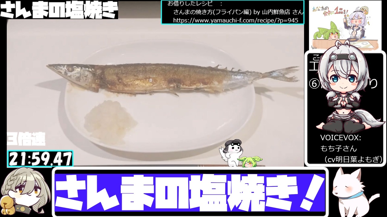 料理初心者が2回目に作る料理にチャレンジします!<br><br>参考にしたレシピはこちら<br> さんまの焼き方(フライパン編) by 山内鮮魚店 さん<br> <a href="https://www.yamauchi-f.com/recipe/?p=945" target="_blank" rel="noopener nofollow">https://www.yamauchi-f.com/recipe/?p=945</a><br /><br>編集に使用させていただいているものは、プロフィールみてね!<br><a href="https://www.nicovideo.jp/user/311366" target="_blank" rel="noopener nofollow">https://www.nicovideo.jp/user/311366</a><br><br>読み上げ:VOICEVOX もち子(cv明日葉よもぎ)、ずんだもん、四国めたん、青山龍星、WhiteCUL、伊織弓鶴、COEIROINK:猫米茶<br><br><strong>過去の動画にコメント、いいね!、ギフト、広告、フォロー、マイリストありがとうございました!</strong><br><br>とり料理祭ありがとうございました!<br>2023参加作品はこちら ⇒ <a href="https://www.nicovideo.jp/mylist/75430531" target="_blank" rel="noopener nofollow">https://www.nicovideo.jp/mylist/75430531</a><br>2024冬参加作品はこちら ⇒ <a href="https://www.nicovideo.jp/mylist/75862737" target="_blank" rel="noopener nofollow">https://www.nicovideo.jp/mylist/75862737</a><br>2024夏参加作品はこちら ⇒ <a href="https://www.nicovideo.jp/mylist/76572716" target="_blank" rel="noopener nofollow">https://www.nicovideo.jp/mylist/76572716</a><br>2025冬参加作品はこちら ⇒ <a href="https://www.nicovideo.jp/mylist/77171241" target="_blank" rel="noopener nofollow">https://www.nicovideo.jp/mylist/77171241</a><br>2025夏参加作品はこちら ⇒ <a href="https://www.nicovideo.jp/mylist/77600849" target="_blank" rel="noopener nofollow">https://www.nicovideo.jp/mylist/77600849</a><br><br>このその日ごとになんか出す定食屋か駄菓子屋のごとき動画を継続して投稿するために<br>スポンサーをひっそり募集しております、あなたも一口いかが?<br><a href="https://creator-support.nicovideo.jp/registration/311366" target="_blank" rel="noopener nofollow">https://creator-support.nicovideo.jp/registration/311366</a>