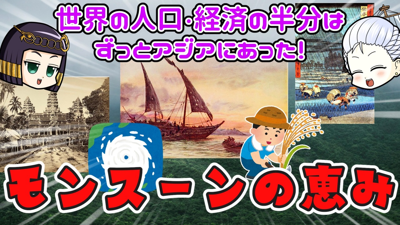 マリーはたまものについて疑問があるようです。 <br>日本の四季はモンスーンの影響だし、東南アジアに雨が多いのも、インド洋に風が吹くのもモンスーンのおかげ。 <br>っていうことくらいは割と知っているけど、ローマ帝国はじめ西欧諸国がずっとアジアに金銀を流出させまくっていた歴史もモンスーンがつくっていたとは。 <br><br>☆ニコニコチャンネル「モンド・ヒストリカの離宮」 <br>→<a href="https://ch.nicovideo.jp/mond-historica" target="_blank" rel="noopener nofollow">https://ch.nicovideo.jp/mond-historica</a> <br><br>今回の参考文献: <br>安成哲三(2023)『モンスーンの世界 日本、アジア、地球の風土の未来可能性』中央公論新社<br>佐藤洋一郎(2016)『食の人類史 ユーラシアの狩猟・採集、農耕、遊牧』中央公論新社<br>上田信(2006)『東ユーラシアの生態環境史』山川出版社<br>島泰三(2020)『魚食の人類史』NHK出版<br>今井明子(2022)『面白いほどスッキリわかる!世界の気候と天気のしくみ』産業編集センター<br>(2016)『エリュトラー海案内記』蔀勇造訳註 平凡社<br>山本博(2018)『ワインの世界史 自然の恵みと人間の知恵の歩み』日経BP<br>合田良實(1996)『土木と文明』鹿島出版会<br>ペニー・ルクーター/ジェイ・バーレサン(2011)『スパイス、爆薬、医薬品 世界史を変えた17の化学物質』(小林力訳)中央公論新社<br><br>その他 Wikipediaなど<br><br>twitter→<a href="https://twitter.com/mond_historica" target="_blank" rel="noopener nofollow">https://twitter.com/mond_historica</a><br />━━━━━━━━━━━━━━━━━━━━━<br><br>この動画はクリエイティブ・コモンズ継承(CC-BY-SA)ライセンスの素材を使用して制作しています。(<a href="https://creativecommons.org/licenses/by-sa/4.0/)" target="_blank" rel="noopener nofollow">https://creativecommons.org/licenses/by-sa/4.0/)</a><br>規約に基づき、この動画もCC-BY-SA 4.0 のもとで公開します。<br><br>投稿者共通情報☆彡<br><br>BGM, SE:ニコニ・コモンズ様<br><a href="http://commons.nicovideo.jp/" target="_blank" rel="noopener nofollow">http://commons.nicovideo.jp/</a><br>魔王魂様<br><a href="https://maoudamashii.jokersounds.com/" target="_blank" rel="noopener nofollow">https://maoudamashii.jokersounds.com/</a><br>Audiostock様<br><a href="https://audiostock.jp/" target="_blank" rel="noopener nofollow">https://audiostock.jp/</a><br><br>立ち絵 霊夢・魔理沙(黒子式):nicotalk様<br><a href="http://www.nicotalk.com/charasozai.html" target="_blank" rel="noopener nofollow">http://www.nicotalk.com/charasozai.html</a><br><br>立ち絵 パトラ、マリー、アン、メアリ:ライフライフ様<br><a href="https://0801lifelife.tumblr.com/" target="_blank" rel="noopener nofollow">https://0801lifelife.tumblr.com/</a><br><br>使用ツール1:ゆっくりムービーメーカー4<br><a href="https://manjubox.net/ymm4/" target="_blank" rel="noopener nofollow">https://manjubox.net/ymm4/</a><br><br>使用ツール2:AviUtl<br><a href="http://spring-fragrance.mints.ne.jp/aviutl/" target="_blank" rel="noopener nofollow">http://spring-fragrance.mints.ne.jp/aviutl/</a><br><br>各時代の地図 : World History Maps & Timelines <br><a href="http://geacron.com/home-en/" target="_blank" rel="noopener nofollow">http://geacron.com/home-en/</a><br><br>ゆっくりボイスについて:AquesTalkライセンス取得済み<br><br>キャラクターボイス<br>アン・ボニー:羽ノ華(A.I.VOICE)<br>メアリ・リード:琴葉 葵(A.I.VOICE)<br>クレオパトラ:結月ゆかり(VOICEROID2)<br>マリー‐アントワネット:東北きりたん (VOICEROID EX)<br>その他キャラ:青山龍星(A.I.VOICE)、伊織弓鶴(A.I.VOICE2)、栗田まろん(A.I.VOICE)、宮舞モカ(VOICEPEAK)、フリモメン(VOICEPEAK)<br><br><br><br>その他フリー素材ご提供元の皆様に圧倒的感謝<br>