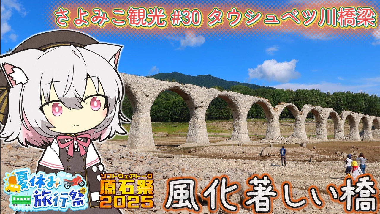 小夜とミコが日本各地のスポットを紹介していきます。<br>今回はタウシュベツ川橋梁についての紹介です。<br>北海道の帯広から70kmほどのところにあるタウシュベツ川橋梁は、旧国鉄の士幌線の橋の1つでした。<br>糠平ダム建設によって糠平湖が出来たため、19年ほどしか使われませんでした。<br>現在は冬場に水没した状態で凍結するため崩落の危険が高いものの、朽ちてゆく様が印象的なため、観光スポットとして扱われています。<br>ツアーや林道ゲートのカギを借りて近くで見ることが出来たり、<br>何も予約をしていなくても国道沿いの展望台から見られるのでよかったら行ってみてください!<br><br>2025/10/21 にニコニコトップページ掲載いただきました!ありがとうございます!<br><br>参考ページ<br>上士幌町HPのページ <a href="https://www.kamishihoro.jp/place/00000072" target="_blank" rel="noopener nofollow">https://www.kamishihoro.jp/place/00000072</a><br>時折更新されている現在のタウシュベツ <a href="http://www.guidecentre.jp/pg5416726.html" target="_blank" rel="noopener nofollow">http://www.guidecentre.jp/pg5416726.html</a><br>ツアー <a href="http://www.guidecentre.jp/philosophy.html" target="_blank" rel="noopener nofollow">http://www.guidecentre.jp/philosophy.html</a><br>林道ゲートの鍵 <a href="https://kamishihoro.info/key/" target="_blank" rel="noopener nofollow">https://kamishihoro.info/key/</a><br><br>撮影日:2025/8/18<br><br>【 使用音声 】<br>VOICEVOX:小夜/SAYO<br>VOICEVOX:櫻歌ミコ<br><br>【 使用立ち絵 】<br>立ち小夜/SAYO素材 / akihiyo さん(ニコニコ静画 <a href="https://seiga.nicovideo.jp/seiga/im11095609" target="_blank" rel="noopener">im11095609</a>)<br>立ち櫻歌ミコ素材 / akihiyo さん(ニコニコ静画 <a href="https://seiga.nicovideo.jp/seiga/im11120636" target="_blank" rel="noopener">im11120636</a>)<br>顔だけさよち立ち絵ver2.0 / やなれお さん(ニコニコ静画 <a href="https://seiga.nicovideo.jp/seiga/im11585763" target="_blank" rel="noopener">im11585763</a>)<br><br>【 使用BGM・ジングル 】<br>Deep_Woods5 / むつき醒 さん (ニコニ・コモンズ <a href="https://commons.nicovideo.jp/works/nc254096" target="_blank" rel="noopener">nc254096</a>)<br>メロディー無し版:<a href="https://commons.nicovideo.jp/works/nc254095" target="_blank" rel="noopener">nc254095</a><br>公式ページ:<a href="https://peritune.com/blog/2021/10/05/deep_woods5/" target="_blank" rel="noopener nofollow">https://peritune.com/blog/2021/10/05/deep_woods5/</a><br>おきなわん・ジングル / Hupple さん <a href="https://dova-s.jp/bgm/play16416.html" target="_blank" rel="noopener nofollow">https://dova-s.jp/bgm/play16416.html</a><br><br>この動画では地理院地図Vectorから加工して作成した地図を使っています<br><br>検索用語句<br>北海道 絶景 橋 士幌線 風化 コンクリートアーチ橋<br>国内旅行 観光スポット 観光地