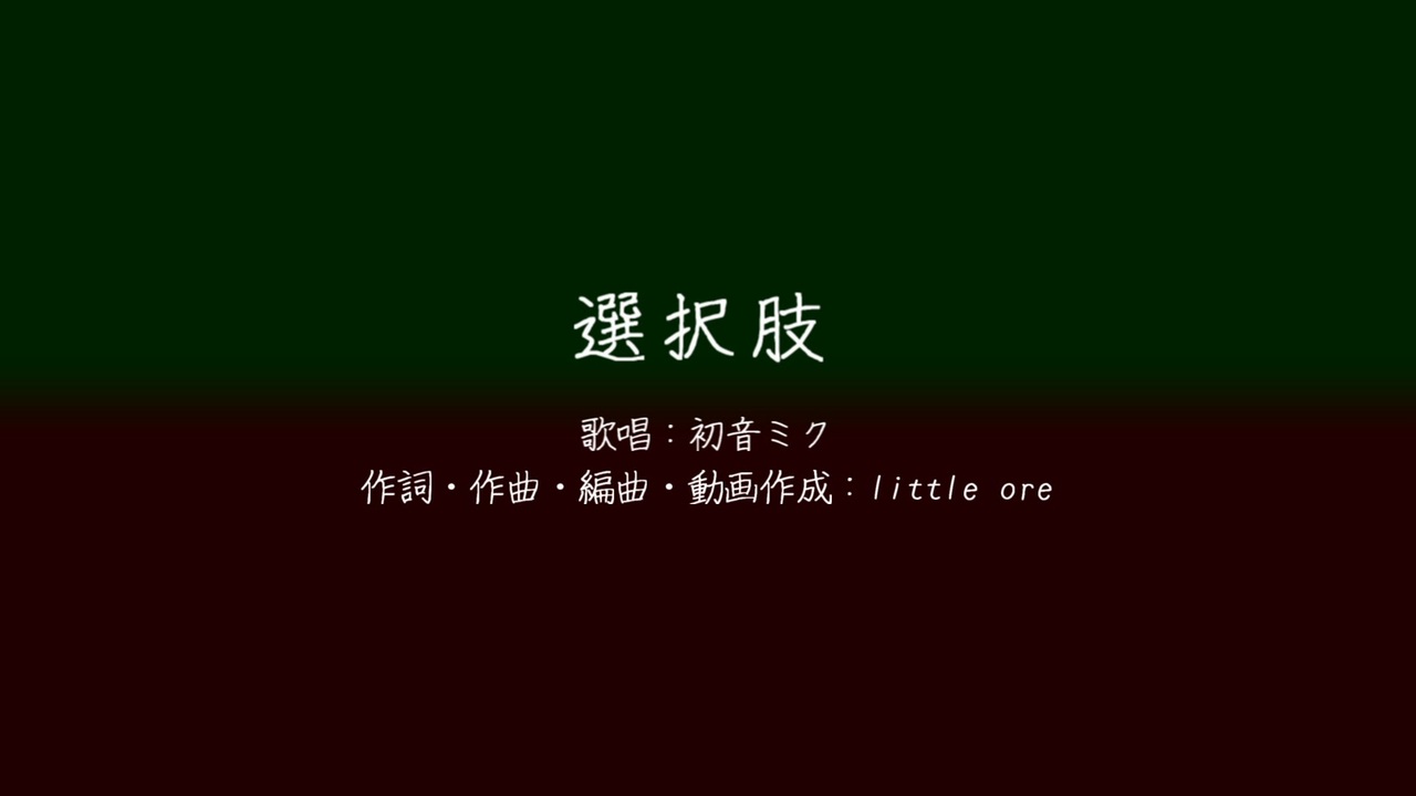 【曲名】<br>選択肢<br> <br>【曲名の読み】<br>せんたくし<br> <br>【歌唱】<br>初音ミク<br> <br>【作詞・作曲・編曲・動画作成】<br>little ore<br> <br>【音源(ボーカル付・オフボーカルの2種、MP3)】<br><a href="https://commons.nicovideo.jp/works/sm45510376" target="_blank" rel="noopener nofollow">https://commons.nicovideo.jp/works/sm45510376</a> <br>※ニコニ・コモンズへのリンクです<br> <br>--<br> <br>「本当のルーキー祭り2025秋」の参加条件を見て、<br>私が「本当のルーキー」を名乗ってよいらしいことに気付いたのは、<br>本動画投稿時刻からさかのぼること27時間ほど前のことでした。<br> <br>当初は完全に諦めモードだったのですが、<br>普段なら3週間かかっても完成しない歌詞がなんと30分でできたので、<br>やれるだけのことはやってみよう、という選択をしました。<br>その結果、今この説明文を書くに至っています。早くしないと締切来ちゃう<br> <br>生きていると、一生を左右する重大事項から日常の些細なことまで、<br>実にさまざまな「選択」の機会があります。<br>私たちの過去は無数の「選択」の結果によって形作られ、<br>未来は数多の「選択」によってその方向性が定まっていきます。<br> <br>一見大したことなさそうな選択が、実は人生の重要な分岐点だった、<br>ということも、万に一つくらいはあるかもしれません。<br>そう考えると、どうでもいいことにあれこれ悩んでいる時間も、<br>なんだか無駄ではないような気がしてきます。<br>まあ、早く決めることができるならそれに越したことはないのですが……。