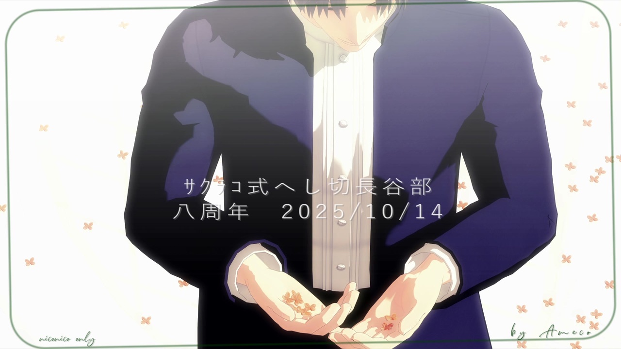 10月14日はサクラコ式へし切長谷部さん配布八周年です。<br><br>大好きなさくべさんのお祝いを、今年も完璧にっ!<br>って意気込んでいたのですが、撮ろうとしていた動画が思うように撮れず<br>断念して別の動画(この動画)を撮りなおし始めたのが5日前という…。<br><br>この動画もずーっと撮りたかったものではあります。<br>が、ちょっとお誕生日動画にするには内容が暗めです。<br>いつも可愛めになってしまう弊本丸のさくべさんを本来の姿に戻したかったので、今年はプリンは封印です。<br>どうしても裸足のさくべさんが撮りたくて、素手、裸足のシーンが出てきます。<br>なんだかとても背徳的(弊本丸比)<br><br>さくべさん、今までありがとう。そして、これからもよろしくおねがいします。<br>八周年おめでとうございます。<br><br>※この動画は、何でも許せる方向きです。<br><br>曲/くじら様 <a href="https://www.youtube.com/watch?v=d3OrMEFbsj4" target="_blank" rel="noopener nofollow">https://www.youtube.com/watch?v=d3OrMEFbsj4</a><br>歌/Ado様 <a href="https://www.youtube.com/watch?v=Baw-cAvS5xc" target="_blank" rel="noopener nofollow">https://www.youtube.com/watch?v=Baw-cAvS5xc</a><br>振付/かりんとう様 <a href="https://www.nicovideo.jp/watch/sm37251760" class="watch">sm37251760</a><br>モーション・カメラ/かなめん様 <a href="https://www.nicovideo.jp/watch/sm40558994" class="watch">sm40558994</a><br>サクラコ式へし切長谷部/サクラコ様 <a href="https://www.nicovideo.jp/watch/sm32097667" class="watch">sm32097667</a><br><br>シアン様、ハク様、nohaha様、Kabura様、茶柱J様、桜緒様、bikke様、マロン様、blue22様、rino様、みくろ様(2)、mymt様、mt_pan様、エピクロス様(18)、広告ありがとうございました。とてもうれしかったです!<br>(2月1日追記)<br>クリエイターチケット、ありがとうございました(10月30日)<br><br><a href="https://www.nicovideo.jp/mylist/59407914" target="_blank" rel="noopener">mylist/59407914</a><br><br>※転載禁止/Reproduction is prohibited./禁止私自转载<br>※AI学習禁止