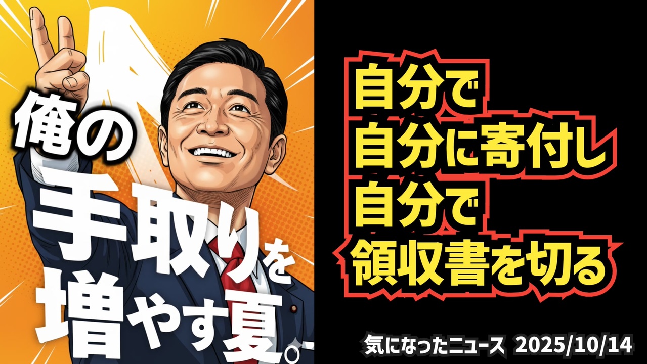 【合法?違法?】◆自分で自分に寄付し自分で領収書を切る次期総理候補 <br><br>あらすじ<br>玉木雄一郎代表が「自分で自分に寄付していた」という政治資金の使い方が話題に。法律上は問題ないとされるものの、「寄附金控除」による税制上の優遇を受けていた可能性が指摘されています。元財務官僚として制度を熟知した“合法的節税”なのか、それとも“道義的にアウト”なのか。国民の負担が増える中で、政治家が自分に都合の良い仕組みを利用しているように見えることへの疑問が広がっています。あなたは、この行為をどう感じますか?政治とお金のリアルに迫ります。<br><br>◆今回の台本(詳細)<a href="https://keiichiro8140.hatenablog.com/entry/25101444333999" target="_blank" rel="noopener nofollow">https://keiichiro8140.hatenablog.com/entry/25101444333999</a><br><br>◆もしも(BAN)の時のためのマイリンク集<a href="https://lit.link/K16_888" target="_blank" rel="noopener nofollow">https://lit.link/K16_888</a><br><br>◆YouTubeチャンネル登録よろしくお願いします🙏 <a href="https://www.youtube.com/@K16news888" target="_blank" rel="noopener nofollow">https://www.youtube.com/@K16news888</a><br><br>ご覧いただきありがとうございます<br>m(_ _)m<br>気になったニュース 2025/10/14<br><br />著作権、肖像権に配慮して作成しております。<br><br>◆気になったニュースの台本!?<br>メモ代わりに作った台本をそのままあげてます<br><a href="https://keiichiro8140.hatenablog.com/." target="_blank" rel="noopener nofollow">https://keiichiro8140.hatenablog.com/.</a><br><br><br>ここからはシリーズ紹介<br><br><br>◆ ワクチン解毒・デトックス<br><a href="https://x.gd/fZweg" target="_blank" rel="noopener nofollow">https://x.gd/fZweg</a><br><br>◆ウイリアム・マキス博士のがん治療(イベルメクチン・フェンベンダゾール等)<br><a href="https://x.gd/AtFYS" target="_blank" rel="noopener nofollow">https://x.gd/AtFYS</a><br><br>◆予防接種健康被害救済制度<br><a href="https://x.gd/0xK9x" target="_blank" rel="noopener nofollow">https://x.gd/0xK9x</a><br><br>◆気になったニュース #1501~<br><br>◆ 【ショートver】気になったニュース<br><a href="https://x.gd/7MxXC" target="_blank" rel="noopener nofollow">https://x.gd/7MxXC</a><br><br>◆ 気になったニュース #1001~<br><a href="https://x.gd/Lp8gv" target="_blank" rel="noopener nofollow">https://x.gd/Lp8gv</a><br><br>◆ 気になったニュース #501~<br><a href="https://x.gd/EmbS4" target="_blank" rel="noopener nofollow">https://x.gd/EmbS4</a><br><br>◆ 気になったニュース #1~#500<br><a href="https://x.gd/uPhNb" target="_blank" rel="noopener nofollow">https://x.gd/uPhNb</a><br><br>◆ X(旧Twitter)・テレグラムで気になった情報<br><a href="https://x.gd/YG6FT" target="_blank" rel="noopener nofollow">https://x.gd/YG6FT</a><br><br>◆ 日比谷5万人パレードデ⚪生放送アーカイブ動画<br><a href="https://x.gd/3CHJv" target="_blank" rel="noopener nofollow">https://x.gd/3CHJv</a><br><br>◆日比谷5万人パレード⚪モのマイリスト作ってみました<br><a href="https://nico.ms/mylist/76828848?ref=sp_other" target="_blank" rel="noopener nofollow">https://nico.ms/mylist/76828848?ref=sp_other</a><br><br>◆3.30 令和の百姓⚪⚪<br><a href="https://www.nicovideo.jp/series/511791?ref=garage_share_other" target="_blank" rel="noopener nofollow">https://www.nicovideo.jp/series/511791?ref=garage_share_other</a><br><br>◆ 及川幸久さんの【XNEWS】シリーズ<br><a href="https://x.gd/3k78K" target="_blank" rel="noopener nofollow">https://x.gd/3k78K</a><br><br>◆これまでの動画<a href="https://x.gd/sPXoJ" target="_blank" rel="noopener nofollow">https://x.gd/sPXoJ</a><br><br>◆もしも(BAN)の時のためのマイリンク集<a href="https://lit.link/K-16_News44" target="_blank" rel="noopener nofollow">https://lit.link/K-16_News44</a><br><br>