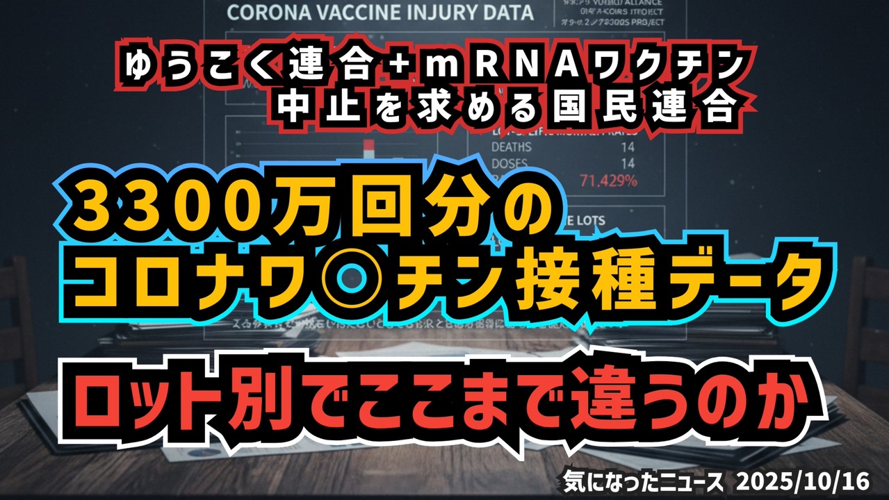 ◆およそ3300万回接種分のコロナワクチン接種後死亡データ ~ ロット別死亡率 ~ ゆうこく連合+mRNAワクチン中止を求める国民連合<br><br>あらすじ <br>全国85自治体から集められた約3,300万回分の接種データをもとに、ロット番号ごとの死亡率を集計した結果――。<br>全体の死亡率はおおむね一定の傾向を示す中で、一部のロットにおいて異常に高い数値が確認されました。<br>中には、接種数が突出して多く、同時に死亡数も多いロットも存在します。<br>※因果関係を断定するものではありません。<br>※全国85自治体から集められた約3,300万回分の接種データのアクチャルです<br><br>◆今回の台本(詳細)<a href="https://keiichiro8140.hatenablog.com/entry/25101666111" target="_blank" rel="noopener nofollow">https://keiichiro8140.hatenablog.com/entry/25101666111</a><br><br>◆もしも(BAN)の時のためのマイリンク集<a href="https://lit.link/K16_888" target="_blank" rel="noopener nofollow">https://lit.link/K16_888</a><br><br>◆YouTubeチャンネル登録よろしくお願いします🙏 <a href="https://www.youtube.com/@K16news888" target="_blank" rel="noopener nofollow">https://www.youtube.com/@K16news888</a><br><br>ご覧いただきありがとうございます<br>m(_ _)m<br>気になったニュース 2025/10/16<br><br />著作権、肖像権に配慮して作成しております。<br><br>◆気になったニュースの台本!?<br>メモ代わりに作った台本をそのままあげてます<br><a href="https://keiichiro8140.hatenablog.com/." target="_blank" rel="noopener nofollow">https://keiichiro8140.hatenablog.com/.</a><br><br><br>ここからはシリーズ紹介<br><br><br>◆ ワクチン解毒・デトックス<br><a href="https://x.gd/fZweg" target="_blank" rel="noopener nofollow">https://x.gd/fZweg</a><br><br>◆ウイリアム・マキス博士のがん治療(イベルメクチン・フェンベンダゾール等)<br><a href="https://x.gd/AtFYS" target="_blank" rel="noopener nofollow">https://x.gd/AtFYS</a><br><br>◆予防接種健康被害救済制度<br><a href="https://x.gd/0xK9x" target="_blank" rel="noopener nofollow">https://x.gd/0xK9x</a><br><br>◆気になったニュース #1501~<br><br>◆ 【ショートver】気になったニュース<br><a href="https://x.gd/7MxXC" target="_blank" rel="noopener nofollow">https://x.gd/7MxXC</a><br><br>◆ 気になったニュース #1001~<br><a href="https://x.gd/Lp8gv" target="_blank" rel="noopener nofollow">https://x.gd/Lp8gv</a><br><br>◆ 気になったニュース #501~<br><a href="https://x.gd/EmbS4" target="_blank" rel="noopener nofollow">https://x.gd/EmbS4</a><br><br>◆ 気になったニュース #1~#500<br><a href="https://x.gd/uPhNb" target="_blank" rel="noopener nofollow">https://x.gd/uPhNb</a><br><br>◆ X(旧Twitter)・テレグラムで気になった情報<br><a href="https://x.gd/YG6FT" target="_blank" rel="noopener nofollow">https://x.gd/YG6FT</a><br><br>◆ 日比谷5万人パレードデ⚪生放送アーカイブ動画<br><a href="https://x.gd/3CHJv" target="_blank" rel="noopener nofollow">https://x.gd/3CHJv</a><br><br>◆日比谷5万人パレード⚪モのマイリスト作ってみました<br><a href="https://nico.ms/mylist/76828848?ref=sp_other" target="_blank" rel="noopener nofollow">https://nico.ms/mylist/76828848?ref=sp_other</a><br><br>◆3.30 令和の百姓⚪⚪<br><a href="https://www.nicovideo.jp/series/511791?ref=garage_share_other" target="_blank" rel="noopener nofollow">https://www.nicovideo.jp/series/511791?ref=garage_share_other</a><br><br>◆ 及川幸久さんの【XNEWS】シリーズ<br><a href="https://x.gd/3k78K" target="_blank" rel="noopener nofollow">https://x.gd/3k78K</a><br><br>◆これまでの動画<a href="https://x.gd/sPXoJ" target="_blank" rel="noopener nofollow">https://x.gd/sPXoJ</a><br><br>◆もしも(BAN)の時のためのマイリンク集<a href="https://lit.link/K-16_News44" target="_blank" rel="noopener nofollow">https://lit.link/K-16_News44</a><br><br>