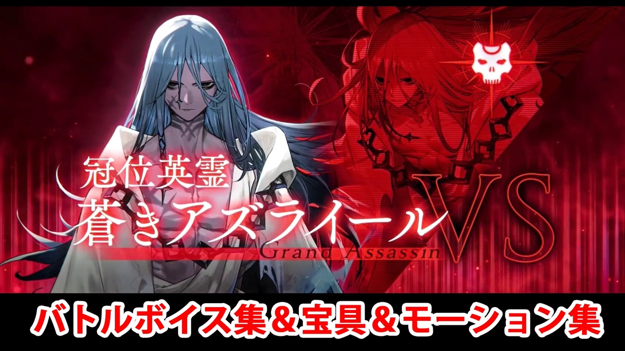 「冠位戴冠戦:Assassin」での冠位英霊・蒼きアズライール(CV:金本涼輔)のアタック、宝具、スキル使用、被ダメージ、戦闘不能のバトルモーションとバトルボイスのまとめです。<br><br>戦闘開始・撃破時ボイスのみ解放戦・研鑽戦と認定戦で変化します。<br><br>宝具「晩鐘の天使(マラク・アル・マウト)」<br><br>【チャプター】<br><a href="#" class="seekTime" data-seekTime="0:00" onclick="seekNicoPlayer('#0:00'); return false;">#0:00</a> 冠位解放戦 登場演出<br><a href="#" class="seekTime" data-seekTime="0:32" onclick="seekNicoPlayer('#0:32'); return false;">#0:32</a> アタック&スキルモーション<br><a href="#" class="seekTime" data-seekTime="1:43" onclick="seekNicoPlayer('#1:43'); return false;">#1:43</a> 宝具(ボイス2種類)<br><a href="#" class="seekTime" data-seekTime="2:30" onclick="seekNicoPlayer('#2:30'); return false;">#2:30</a> 解放戦・研鑽戦 撃破ボイス(2種類)<br><a href="#" class="seekTime" data-seekTime="2:51" onclick="seekNicoPlayer('#2:51'); return false;">#2:51</a> 冠位認定戦 登場演出<br><a href="#" class="seekTime" data-seekTime="4:17" onclick="seekNicoPlayer('#4:17'); return false;">#4:17</a> 冠位認定戦 撃破ボイス<br><br>YouTube版はこちら<br><a href="https://www.youtube.com/watch?v=Alb6vzMesfA" target="_blank" rel="noopener nofollow">https://www.youtube.com/watch?v=Alb6vzMesfA</a><br><br />投稿済ボイス集→<a href="https://www.nicovideo.jp/mylist/57873980" target="_blank" rel="noopener">mylist/57873980</a>、<a href="https://www.nicovideo.jp/mylist/68037946" target="_blank" rel="noopener">mylist/68037946</a>、<a href="https://www.nicovideo.jp/mylist/76708013" target="_blank" rel="noopener">mylist/76708013</a>