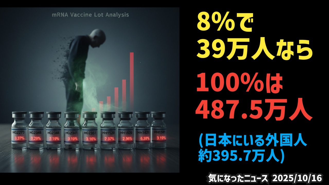 【前回動画の続編・閲覧注意】ロット別死亡率の死亡数を見て、死亡数の数が合わないなと思って出来た動画 ~ 免疫ない人は見ないでください<br><br>◆今回の台本(詳細)<a href="https://keiichiro8140.hatenablog.com/entry/25101666222" target="_blank" rel="noopener nofollow">https://keiichiro8140.hatenablog.com/entry/25101666222</a><br><br>◆もしも(BAN)の時のためのマイリンク集<a href="https://lit.link/K16_888" target="_blank" rel="noopener nofollow">https://lit.link/K16_888</a><br><br>◆YouTubeチャンネル登録よろしくお願いします🙏 <a href="https://www.youtube.com/@K16news888" target="_blank" rel="noopener nofollow">https://www.youtube.com/@K16news888</a><br><br>ご覧いただきありがとうございます<br>m(_ _)m<br>気になったニュース 2025/10/16<br><br />著作権、肖像権に配慮して作成しております。<br><br>◆気になったニュースの台本!?<br>メモ代わりに作った台本をそのままあげてます<br><a href="https://keiichiro8140.hatenablog.com/." target="_blank" rel="noopener nofollow">https://keiichiro8140.hatenablog.com/.</a><br><br><br>ここからはシリーズ紹介<br><br><br>◆ ワクチン解毒・デトックス<br><a href="https://x.gd/fZweg" target="_blank" rel="noopener nofollow">https://x.gd/fZweg</a><br><br>◆ウイリアム・マキス博士のがん治療(イベルメクチン・フェンベンダゾール等)<br><a href="https://x.gd/AtFYS" target="_blank" rel="noopener nofollow">https://x.gd/AtFYS</a><br><br>◆予防接種健康被害救済制度<br><a href="https://x.gd/0xK9x" target="_blank" rel="noopener nofollow">https://x.gd/0xK9x</a><br><br>◆気になったニュース #1501~<br><br>◆ 【ショートver】気になったニュース<br><a href="https://x.gd/7MxXC" target="_blank" rel="noopener nofollow">https://x.gd/7MxXC</a><br><br>◆ 気になったニュース #1001~<br><a href="https://x.gd/Lp8gv" target="_blank" rel="noopener nofollow">https://x.gd/Lp8gv</a><br><br>◆ 気になったニュース #501~<br><a href="https://x.gd/EmbS4" target="_blank" rel="noopener nofollow">https://x.gd/EmbS4</a><br><br>◆ 気になったニュース #1~#500<br><a href="https://x.gd/uPhNb" target="_blank" rel="noopener nofollow">https://x.gd/uPhNb</a><br><br>◆ X(旧Twitter)・テレグラムで気になった情報<br><a href="https://x.gd/YG6FT" target="_blank" rel="noopener nofollow">https://x.gd/YG6FT</a><br><br>◆ 日比谷5万人パレードデ⚪生放送アーカイブ動画<br><a href="https://x.gd/3CHJv" target="_blank" rel="noopener nofollow">https://x.gd/3CHJv</a><br><br>◆日比谷5万人パレード⚪モのマイリスト作ってみました<br><a href="https://nico.ms/mylist/76828848?ref=sp_other" target="_blank" rel="noopener nofollow">https://nico.ms/mylist/76828848?ref=sp_other</a><br><br>◆3.30 令和の百姓⚪⚪<br><a href="https://www.nicovideo.jp/series/511791?ref=garage_share_other" target="_blank" rel="noopener nofollow">https://www.nicovideo.jp/series/511791?ref=garage_share_other</a><br><br>◆ 及川幸久さんの【XNEWS】シリーズ<br><a href="https://x.gd/3k78K" target="_blank" rel="noopener nofollow">https://x.gd/3k78K</a><br><br>◆これまでの動画<a href="https://x.gd/sPXoJ" target="_blank" rel="noopener nofollow">https://x.gd/sPXoJ</a><br><br>◆もしも(BAN)の時のためのマイリンク集<a href="https://lit.link/K-16_News44" target="_blank" rel="noopener nofollow">https://lit.link/K-16_News44</a><br><br>