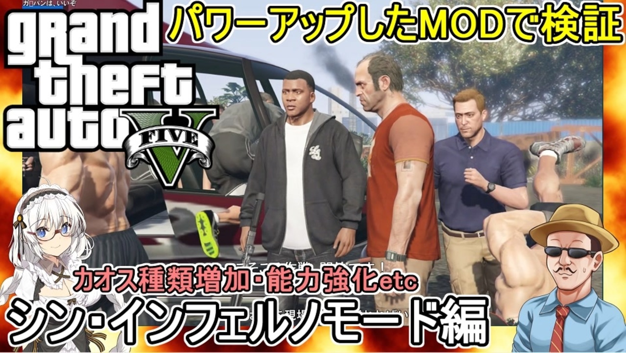 先日アプデされたインフェルノMOD<br>カオスの種類が増えていたり既存カオスの能力が強化されたり<br>特に大きい変更はカットシーンカオスモードでムービーシーンをよりカオスにできるぞ!<br>今回はその新要素を使ってさっそくどんなカオスになるか検証してみたゾ!<br><br>GTA磯野モードは定期的に配信で行っているので興味がある人は遊びに来てね!<br><a href="https://www.nicovideo.jp/user/2620730/live_programs?ref=pc_userpage_menu" target="_blank" rel="noopener nofollow">https://www.nicovideo.jp/user/2620730/live_programs?ref=pc_userpage_menu</a><br><br>YouTube高画質版:<a href="https://youtu.be/W1ifqW_Lgbs" target="_blank" rel="noopener nofollow">https://youtu.be/W1ifqW_Lgbs</a><br>Twitter::<a href="https://twitter.com/naoreisen" target="_blank" rel="noopener nofollow">https://twitter.com/naoreisen</a><br><br>次回 ふにんがす:AmongUs:裏切りのナイスサポーター編:<a href="https://www.nicovideo.jp/watch/sm45544236" class="watch">sm45544236</a><br><br>前回 第二回ふにんがすガンダムファイブボンバーPart3:<a href="https://www.nicovideo.jp/watch/sm45513942" class="watch">sm45513942</a><br>前回 ふにんがす:AmongUs:何もせず勝利・敗北編:<a href="https://www.nicovideo.jp/watch/sm45487354" class="watch">sm45487354</a><br>前回 GTA5:夏休み編2025:最終回:<a href="https://www.nicovideo.jp/watch/sm45480486" class="watch">sm45480486</a><br>前回 第二回ガンダムファイブボンバー:Part2<br>前回 GTA5:カオス磯野モード:最凶鬼畜ロードレース編:<a href="https://www.nicovideo.jp/watch/sm45424288" class="watch">sm45424288</a><br>前回 パーティアニマルズ:イタズラ妨害狸編:<a href="https://www.nicovideo.jp/watch/sm45113701" class="watch">sm45113701</a><br>前回 凪尾クラフト:トライアルチャンバー編:<a href="https://www.nicovideo.jp/watch/sm44573824" class="watch">sm44573824</a><br>前回 猫ミームブラック企業動画:<a href="https://www.nicovideo.jp/watch/sm43364794" class="watch">sm43364794</a><br>前回 GTA動画:KICK BACK PV再現:<a href="https://www.nicovideo.jp/watch/sm41527305" class="watch">sm41527305</a><br />ふにんがす動画マイリスト <a href="https://www.nicovideo.jp/mylist/71314393" target="_blank" rel="noopener">mylist/71314393</a><br>GTA5手配度MAXシリーズ <a href="https://www.nicovideo.jp/mylist/18374381" target="_blank" rel="noopener">mylist/18374381</a><br><br>【凪尾マイクラ等サーバー参加方法】<br>ニコニコ凪尾チャンネル・クリエイターサポート加入者・NicoFTパス所持者 YouTubeメンバーシップゴールド以上の方々が参加できます! 分からないことがあったら気軽に質問してください!<br>ニコニコチャンネル<br><a href="https://ch.nicovideo.jp/nagio-gta?ref=pc_mypage_top" target="_blank" rel="noopener nofollow">https://ch.nicovideo.jp/nagio-gta?ref=pc_mypage_top</a><br>※会員限定動画はニコニコチャンネル加入者・YouTubeメンバーシップノーマル以上から視聴できます。<br><br>■超会議2025グッズ通販(pixivBooth)<br><a href="https://nagio-gta25252.booth.pm/" target="_blank" rel="noopener nofollow">https://nagio-gta25252.booth.pm/</a><br>■ずんだもん立ち絵公開しました<br><a href="http://nico.ms/im10892141" target="_blank" rel="noopener nofollow">http://nico.ms/im10892141</a><br>■琴葉姉妹立ち絵公開しました<br><a href="https://seiga.nicovideo.jp/seiga/im10803182" target="_blank" rel="noopener nofollow">https://seiga.nicovideo.jp/seiga/im10803182</a><br><br>楽曲提供:ぺんぺんさん:<a href="https://www.nicovideo.jp/user/93911302" target="_blank" rel="noopener">user/93911302</a><br>ふにちかさん作凪尾立ち絵:<a href="https://seiga.nicovideo.jp/seiga/im10956602?nicorepotwitter_upload_illust" target="_blank" rel="noopener nofollow">https://seiga.nicovideo.jp/seiga/im10956602?nicorepotwitter_upload_illust</a><br><br>▼以下配信活動ページ:よかったら登録してね!<br>ニコ生<br><a href="https://www.nicovideo.jp/user/2620730/live_programs?ref=pc_userpage_menu" target="_blank" rel="noopener nofollow">https://www.nicovideo.jp/user/2620730/live_programs?ref=pc_userpage_menu</a><br>YouTubeiS4mQ7q8w?sub_confirmation=1<br>Twitch:<a href="https://www.twitch.tv/nagiogames" target="_blank" rel="noopener nofollow">https://www.twitch.tv/nagiogames</a><br>ツイキャス:<a href="https://twitcasting.tv/g:106250988999788152314" target="_blank" rel="noopener nofollow">https://twitcasting.tv/g:106250988999788152314</a><br><br>VOICEVOX:ずんだもん VOICEVOX:九州そら