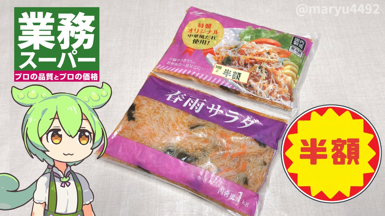賞味期限が当日までの1kgサイズの春雨サラダがあったので購入しました。<br><br><br>【関連動画】<br>業務スーパーの「デカイ焼きそば(268円)」2023.10.29<br><a href="https://www.nicovideo.jp/watch/sm42928799" target="_blank" rel="noopener nofollow">https://www.nicovideo.jp/watch/sm42928799</a><br>業務スーパーの500g2パックで使いやすい「タラモサラダ」2024.03.23<br><a href="https://www.nicovideo.jp/watch/sm43538377" target="_blank" rel="noopener nofollow">https://www.nicovideo.jp/watch/sm43538377</a><br><br>【参考】<br>春雨サラダ(業務スーパー)<br><a href="https://www.gyomusuper.jp/product/detail.php?go_id=7648" target="_blank" rel="noopener nofollow">https://www.gyomusuper.jp/product/detail.php?go_id=7648</a><br>秦食品株式会社<br><a href="http://www.hatafoods.co.jp/" target="_blank" rel="noopener nofollow">http://www.hatafoods.co.jp/</a><br>「業務スーパー」中に入ってわかった製販一体の強み(東洋経済オンライン)<br><a href="https://toyokeizai.net/articles/-/858537?display=b" target="_blank" rel="noopener nofollow">https://toyokeizai.net/articles/-/858537?display=b</a><br>秦食品は、「改善し続けている」会社です。(エンゲージ)<br><a href="https://en-gage.net/hatafoods_jobs/" target="_blank" rel="noopener nofollow">https://en-gage.net/hatafoods_jobs/</a><br><br>【使用した素材】(※敬称略) <br>(合成音声)VOICEVOX/ずんだもん/四国めたん<br><a href="https://voicevox.hiroshiba.jp/" target="_blank" rel="noopener nofollow">https://voicevox.hiroshiba.jp/</a> <br>(立ち絵)坂本アヒル<br> <a href="https://seiga.nicovideo.jp/seiga/im10788496" target="_blank" rel="noopener nofollow">https://seiga.nicovideo.jp/seiga/im10788496</a><br>(楽曲)甘茶の音楽工房/「楽しい麦畑」「フルーツパフェ」「お城の舞踏会」<br><a href="https://amachamusic.chagasi.com/" target="_blank" rel="noopener nofollow">https://amachamusic.chagasi.com/</a>