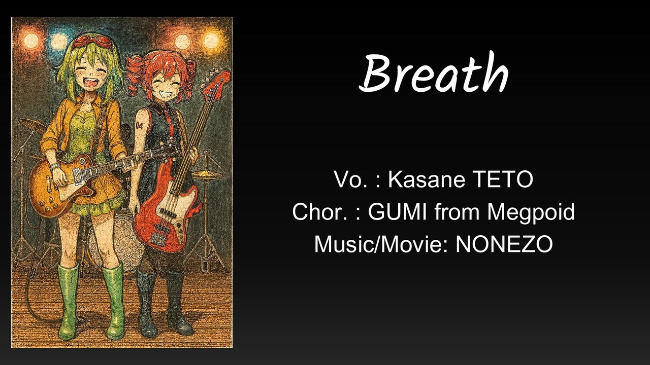 #ボカメロコア投稿祭シーズン2 参加曲です。<br>#はやいボカロ曲投稿祭ver2 参加曲です。<br><br>■Off Vocal: <a href="https://piapro.jp/t/Q3hN" target="_blank" rel="noopener nofollow">https://piapro.jp/t/Q3hN</a><br>■X: <a href="https://x.com/kirin_nonezo" target="_blank" rel="noopener nofollow">https://x.com/kirin_nonezo</a><br>■Youtube: <a href="https://www.youtube.com/@kirin_nonezo" target="_blank" rel="noopener nofollow">https://www.youtube.com/@kirin_nonezo</a><br><br>タイトル:Breath<br>Vocal: 重音テト<br>Chorus: GUMI from Megpoid<br>Music/Movie: NONEZO (きりんのねぞう)<br><br>Illustration generated with Copilot edited and finalized by NONEZO.