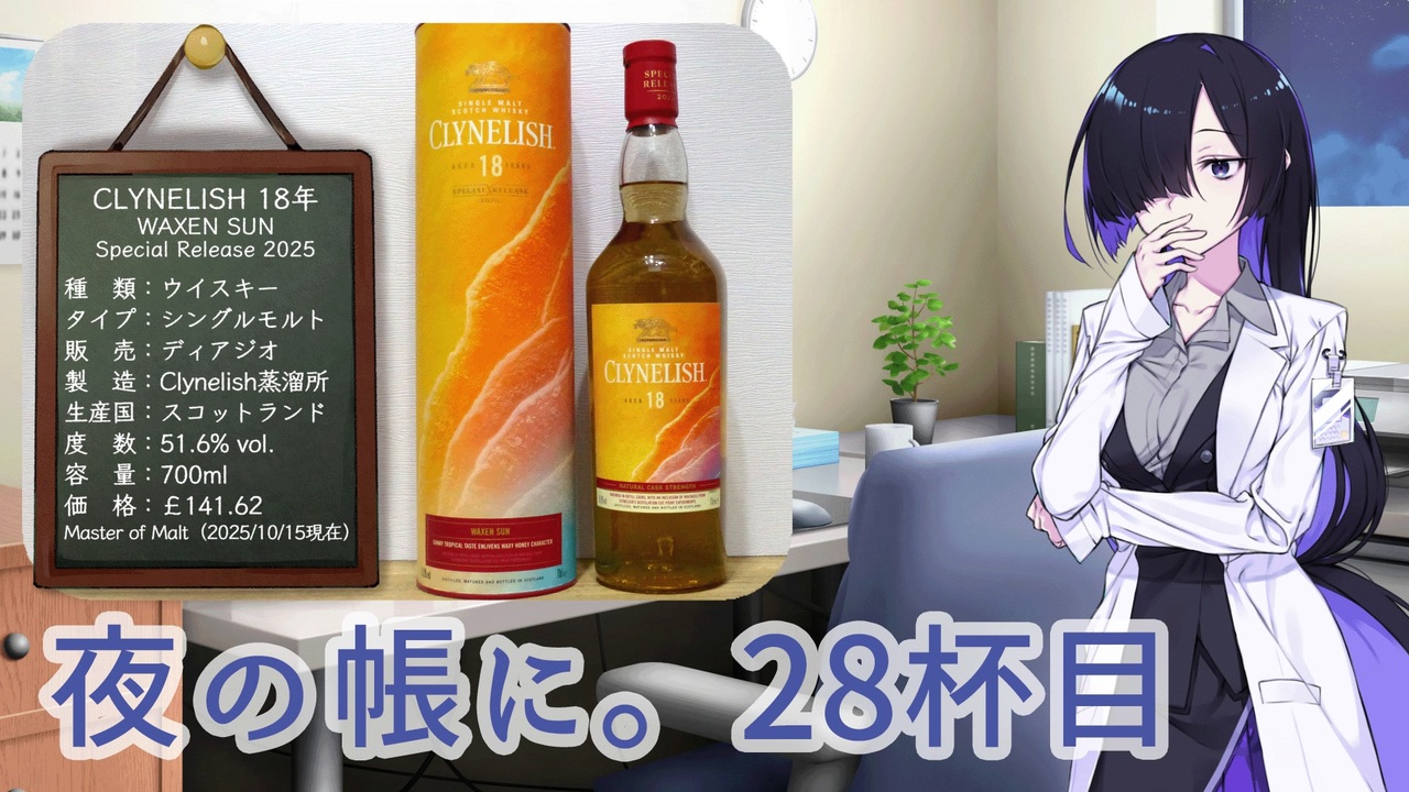 ディアジオスペシャルリリースで公式の14年を超えるClynelishがリリースされたので個人輸入してしまいました。<br>Master of Malt ( <a href="https://www.masterofmalt.com/" target="_blank" rel="noopener nofollow">https://www.masterofmalt.com/</a> )さんから送ってもらいました(有料)。<br><br>日本では、お酒はハタチになってから!<br>お酒は飲みたい人が楽しんで飲みましょう。<br><br>CAST<br> 夜語トバリ(A.I.VOICE Junior)<br><br>立ち絵<br> 聡間まこと 様<br><br>背景<br> みんちり 様<br> <a href="https://min-chi.material.jp/" target="_blank" rel="noopener nofollow">https://min-chi.material.jp/</a><br> Pb 様<br><br>台詞背景<br> 浅井麻 様<br> <a href="https://asavo.fanbox.cc/posts/2066454" target="_blank" rel="noopener nofollow">https://asavo.fanbox.cc/posts/2066454</a><br><br>いいねボタン<br> nakatomi 様<br><br>BGM<br> むつき醒 様(PeriTune)<br> <a href="https://peritune.com/" target="_blank" rel="noopener nofollow">https://peritune.com/</a><br> ♪Cryptic_Canvas<br><br>SE<br> 効果音ラボ 様<br><br>お世話になったツール<br> AviUtl・拡張編集Plugin<br> Aviutl プラグイン 「かんたんMP4出力」<br> <a href="https://aoytsk.blog.jp/aviutl/34586383.html" target="_blank" rel="noopener nofollow">https://aoytsk.blog.jp/aviutl/34586383.html</a><br> PSDToolkit・かんしくん<br> かんしくん設定ファイル作成ツール<br> <a href="https://oov.github.io/forcepser/" target="_blank" rel="noopener nofollow">https://oov.github.io/forcepser/</a><br> AVIUTL 自動呼吸アニメーション<br> L-SMASH・L-SMASH Works<br> <a href="http://l-smash.github.io/l-smash/" target="_blank" rel="noopener nofollow">http://l-smash.github.io/l-smash/</a><br> <a href="https://pop.4-bit.jp/?page_id=7929" target="_blank" rel="noopener nofollow">https://pop.4-bit.jp/?page_id=7929</a><br> ContentsTree プラグイン<br> SplitWindow<br> 相対パス保存プラグイン<br> 縁取りスクリプト<br><br>使用フリーフォント<br> ほのか新アンティーク角<br> <a href="https://font.gloomy.jp/" target="_blank" rel="noopener nofollow">https://font.gloomy.jp/</a><br> チョーク体<br> <a href="http://font.cutegirl.jp/" target="_blank" rel="noopener nofollow">http://font.cutegirl.jp/</a><br> IPAex明朝<br> <a href="https://moji.or.jp/ipafont/" target="_blank" rel="noopener nofollow">https://moji.or.jp/ipafont/</a>