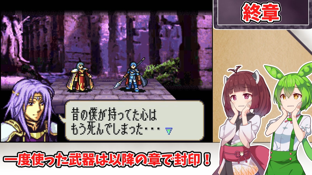 <span style="color: #85200c; font-size: 24px;"><strong><i>さらば親友よ…</i></strong></span><br><br><br><br><span style="font-size: 16px;"><strong>1:一度使用した武器種は、以降の章で使用する事を禁止する。<br>2:武器の使用の定義は『その武器を装備した状態で敵との戦闘が発生したタイミング』<br>または『その武器を売却したタイミング』<br>杖の場合は『対象に対して使用した時点(命中の可否は問わない)』とする。 </strong></span><br><span style="color: #ff0000; font-size: 16px;"><strong>※同盟軍、演出による戦闘イベントでは使用した判定にはならないこととする。</strong></span><span style="font-size: 16px;"><strong> <br>3:仲間候補のユニットを全員加入、生存させた状態でゲームをクリアする。<br>4:上級クラスのユニットは「武器を装備した状態」での戦闘を禁止する。<br>5:バグ技禁止</strong></span><br><br>この動画シリーズ【<a href="https://www.nicovideo.jp/series/516459" target="_blank" rel="noopener">series/516459</a>】<br>『トラ7』の同縛りプレイ【<a href="https://www.nicovideo.jp/series/482976" target="_blank" rel="noopener">series/482976</a>】<br>『烈火』の同縛りプレイ【<a href="https://www.nicovideo.jp/series/406473" target="_blank" rel="noopener">series/406473</a>】<br>『封印』の同縛りプレイ【<a href="https://www.nicovideo.jp/series/316824" target="_blank" rel="noopener">series/316824</a>】<br><br>前:【<a href="https://www.nicovideo.jp/watch/sm45500580" class="watch">sm45500580</a>】次:【<a href="https://www.nicovideo.jp/watch/sm45553104" class="watch">sm45553104</a>】<br><br><strong>使用したソフト</strong><br>VOICEROID+東北きりたんEX<br>VOICEVOX:ずんだもん<br>VOICEPEAK:ずんだもん<br><strong>お借りした素材</strong><br>ニコニコモンズの皆様(コンテンツツリー参照)