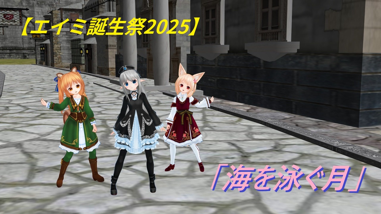 <span style="color: #0000ff; font-size: 24px;"><strong>エイミさんお誕生日おめでとうございます!</strong></span><br>実は選曲に一番悩むのがエイミさんでして、清楚可憐なエイミさんに似合う曲を毎年色々探すのが恒例行事に。<br>今年も結構、悩みました。そんな時はひたすらニコニコ巡回あるのみ。<br>で、辿り着いたのがこの曲でした。<br><br>ユノア&リーア:「私達の時は悩まないの?(怒」<br>主:「い、いやぁ、そこそこ悩むんですけれど、エイミさんの清楚さに合う曲ってなかなか……」<br>ユノア&リーア:「それって、私達が清楚じゃないって事?」<br>主:「あの、そういう訳では……」<br>ユノア&リーア:「あんた、ちょっとこっち来なさい」<br>マリエルさん:「ユノアちゃん!リーアちゃん!これ!」<br>ユノア&リーア:「あ。マリエルちゃん!ハンマー貸してくれるの?ありがと!」<br>マリエルさん:「うん。やっちゃえ♡」<br>主:「ちょ、ちょっと!マリエルさん!?」<br>エイミ:「あらあら♡」<br>ユノア:「私だってこの曲踊った事ある(<a href="https://www.nicovideo.jp/watch/sm38583766" class="watch">sm38583766</a>)んですけれど?」<br>主:「知ってます!知ってますけれどもっ!」<br>ユノア:「リーア、やっておしまい」<br>リーア:「せーのぉ!(ドゴーンっ」<br>主:(…………)<br><br>楽曲:40mP 様【LUMi】 海を泳ぐ月 【オリジナルMV】(<a href="https://www.nicovideo.jp/watch/sm32836542" class="watch">sm32836542</a>)<br>モーション(エイミさん)&カメラ:なつき 様【MMDモーショントレース】ユフに「海を泳ぐ月」を踊ってもらいました【配布】【らぶ式モデルFC10周年祭】(<a href="https://www.nicovideo.jp/watch/sm38956628" class="watch">sm38956628</a>)<br>モーション(ユノアさん&リーアさん):たこはちP 様:【MMD】海を泳ぐ月 (モーション配布)(<a href="https://www.nicovideo.jp/watch/sm33362508" class="watch">sm33362508</a>)<br>ステージ:フレスベルク様 リベルニア公国(<a href="https://www.nicovideo.jp/watch/sm20560217" class="watch">sm20560217</a>)<br>モデル:エイミさん 狐白ましろ 様(<a href="https://3d.nicovideo.jp/works/td89910" target="_blank" rel="noopener">td89910</a>)<br> ユノアさん 狐白ましろ 様(<a href="https://3d.nicovideo.jp/works/td12979" target="_blank" rel="noopener">td12979</a>)※花飾り(L3 様)<br> リーアさん 狐白ましろ 様(<a href="https://3d.nicovideo.jp/works/td89909" target="_blank" rel="noopener">td89909</a>)※ツインテリボン(L3 様)<br>友情出演:マリエルさん:かにひら様(<a href="https://www.nicovideo.jp/watch/sm13760761" class="watch">sm13760761</a>)※モデルファイル消失 ※カチューシャ(72ca 様)<br> ファルファちゃん&シャルシャちゃん:L3 様【スライム倒して300年】ファルファちゃん&シャ ルシャちゃん【モデル配布】(<a href="https://www.nicovideo.jp/watch/sm45502041" class="watch">sm45502041</a>)<br> エルザ(エルザ・アーネル)さん:狐白ましろ 様(<a href="https://3d.nicovideo.jp/works/td92295" target="_blank" rel="noopener">td92295</a>)<br><br>広告御礼は静画(<a href="https://seiga.nicovideo.jp/seiga/im11687854" target="_blank" rel="noopener">im11687854</a>)にて。<br><br />【これまでに投稿した動画リスト】<a href="https://www.nicovideo.jp/mylist/79114913" target="_blank" rel="noopener">mylist/79114913</a><br>【これまでに投稿した静画リスト】<a href="https://seiga.nicovideo.jp/user/illust/7589339" target="_blank" rel="noopener">user/illust/7589339</a><br><br>【その他、常用ツールなど】<br>MikuMikuDance:樋口優 様(<a href="https://www.nicovideo.jp/watch/sm2420025" class="watch">sm2420025</a>)<br>つんでれんこ:窓屋 様(<a href="https://www.nicovideo.jp/watch/sm7634361" class="watch">sm7634361</a>)<br>VMDサイジング:miu 様(<a href="https://seiga.nicovideo.jp/seiga/im9755721" target="_blank" rel="noopener">im9755721</a>)<br>PMXE:とある工房 様<br>MME:舞力介入P 様(<a href="https://www.nicovideo.jp/watch/sm12149815" class="watch">sm12149815</a>)<br>MikuMikuTelop:そぼろ様(<a href="https://www.nicovideo.jp/watch/sm15635052" class="watch">sm15635052</a>)<br>AutoLuminous:そぼろ 様(<a href="https://www.nicovideo.jp/watch/sm19843111" class="watch">sm19843111</a>)<br>スカイドーム:怪獣対若大将P 様、seasalt 様<br>なんやかんや色々なエフェクト:ビームマンP 様<br>とても便利なPMXEプラグイン:L3 様(<a href="https://www.nicovideo.jp/watch/sm44255948" class="watch">sm44255948</a>)<br>葉っぱとか柵とかの周囲を綺麗にするシェーダ:おたもん 様(<a href="https://seiga.nicovideo.jp/seiga/im3131306" target="_blank" rel="noopener">im3131306</a>)<br>大理石を鏡のように綺麗にする魔法:針金P 様「WorkingFloor2.fx ver0.0.8」<br>その他、書ききれないものはコンテンツツリーにて。<br>また、当方使用のモデルは俺得仕様改変したりしておりますのでご了承下さい。<br><br><a target="_blank" href="https://qa.nicovideo.jp/faq/show/19424?site_domain=default" style="font-size: 13px;color: #657586; text-decoration: underline; line-height: 1.4">この動画は投稿者によって修正されました</a>