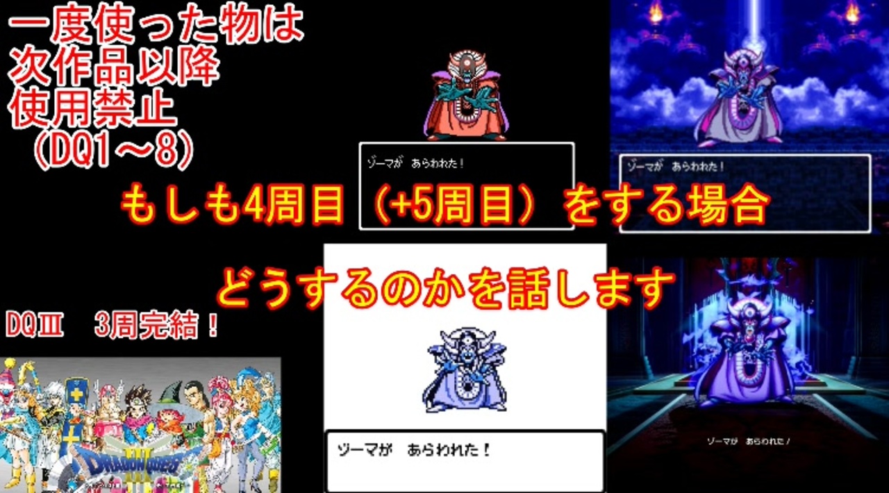 もしも他作品を考慮せずDQⅢ単独で何周できるかを聞かれたら<br><br>①勇武 世界樹の葉<br>②勇戦 ベホマズン+まじんのオノ+賢さの種<br>③勇商 賢者の石+双六<br>④勇賢 ベホマ+命のきのみ<br>⑤勇僧 ベホマラー+力の種<br><br>といった感じで、ルイーダ登録時の種の強制解禁により5周が限界です。<br>職業も分けましたが、流石に勇者の使い回しはありで。<br>ルイーダ種免除ならザオリクで更に可能。<br>裏技ありならGBC版にすれば勇者一人でいけるので何周でも(笑)<br>DQⅢの周回解禁縛り、皆挑戦してみてね!<br><br>前→<a href="https://www.nicovideo.jp/watch/sm45532612" class="watch">sm45532612</a><br>次→<a href="https://www.nicovideo.jp/watch/sm45594903" class="watch">sm45594903</a><br><br>YouTube版→<a href="https://youtu.be/Z0o3CqbLQXM" target="_blank" rel="noopener nofollow">https://youtu.be/Z0o3CqbLQXM</a><br><br>縛りルール(詳細はpart1参照)<br>①一度使った武器・防具・装飾品・道具・呪文・特技は<br> 次作品以降使用禁止。(売却も解禁扱い)<br><br> 一度使った職業(3,6,7)・仲間モンスター(5,6)・スカウトモンスター(8)は<br> 戦士(Ⅲ)、戦士(Ⅵ)のようにナンバリングで分類し次作品以降使用禁止。<br> また複数体加入できる仲間モンスターは一体まで。<br><br>②裏技、バグ技、全滅、逃走、おどかす禁止。<br> またダンジョン攻略とボス戦における状況再現禁止。<br><br>③ダンジョンとボス攻略は、全キャラのレベルを突入時、<br> 1周目は目標レベル+5。2周目は+10。3周目は+15まで。<br> ラスボスの目標レベルは45。裏ボスは50とする。<br>(目標レベルは各公式ガイドブックを参照)<br><br>④1周目はEDまで。2周目は裏ボス撃破まで。<br> 3周目は全てのボスを規定回数、規定ターン以内に倒す。<br>(回避可能なボスも倒し、闇ゾーマは3周全てで倒す)<br><br><br><span style="color: #262626;">※一部機種は互換機を使用してのプレイとなりますが、倍速機能やクイックセーブ・ロード、チートなどは一切使用しません。</span><br><br>※ネタバレ注意です<br><br>この動画で利用している株式会社スクウェア・エニックスを代表とする共同著作者が権利を所有する著作物及びスギヤマ工房有限会社が権利を所有する楽曲の転載・配布は禁止いたします。<br>(C) ARMOR PROJECT/BIRD STUDIO/SQUARE ENIX All Rights Reserved.<br>(C) SUGIYAMA KOBO (P) SUGIYAMA KOBO<br><br>AquesTalk2ライセンスID:AQTK2WINUSR23122185<br /><br><br>❤いいねを押していただけるとモチベーションと投稿速度が上がるので宜しくお願い致します!<br><br>作者ツイッター→ <a href="https://twitter.com/nig0117" target="_blank" rel="noopener nofollow">https://twitter.com/nig0117</a><br>PIXIV FANBOX→ <a href="https://sutanokeiji.fanbox.cc/" target="_blank" rel="noopener nofollow">https://sutanokeiji.fanbox.cc/</a><br><br>( 以前はWEB小説書いてました→ <a href="https://kakuyomu.jp/works/1177354054884910267" target="_blank" rel="noopener nofollow">https://kakuyomu.jp/works/1177354054884910267</a> )