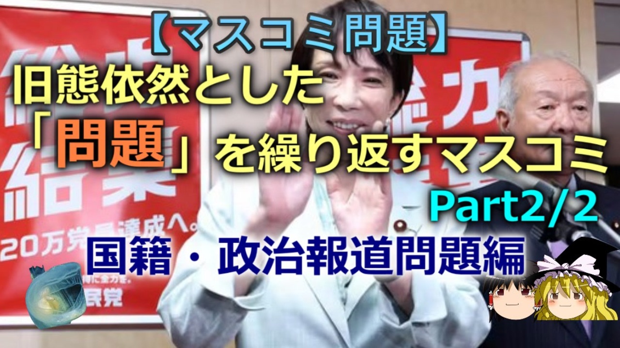 さて、本日は前回に引き続き過去に批判された問題と同じ問題を繰り返すマスコミの問題について扱っていきます。<br>秋どようびの旬の季節<br>本日ブログ記事<br><a href="https://oogchib.hateblo.jp/entry/2025/10/19/210000" target="_blank" rel="noopener nofollow">https://oogchib.hateblo.jp/entry/2025/10/19/210000</a><br><br>元記事<br>旧態依然とした問題を繰り返すマスコミ 2/2<br><a href="http://ooguchib.blog.fc2.com/blog-entry-562.html" target="_blank" rel="noopener nofollow">http://ooguchib.blog.fc2.com/blog-entry-562.html</a><br><br>関連動画<br>【マスコミ問題】マスコミと政治の癒着 part2<br><a href="https://www.nicovideo.jp/watch/sm34681592" class="watch">sm34681592</a><br>【ゆっくり解説】マスコミの不祥事対処法<br><a href="https://www.nicovideo.jp/watch/sm37820197" class="watch">sm37820197</a><br><br>注意<br>・この動画は「マスコミ問題」を扱っています<br><br>・「マスコミ問題」であり右派・左派等の陣営論争は本題ではありません<br><br>・「特定の国との特別な関係」は問題の枝葉です、主問題は業界の体質です<br><br>・自身の常識が相手にとっても常識とは限りません、「他者がそれを見たらど<br>う思うか」という客観性を常に持ちましょう。<br><br>・日常生活で注意する程度には言動に注意を心がけてください<br><br>・リクエストは原則受け付けていません<br><br>・引用ソースへのリンクが同時掲載のブログにあります<br><br>・毎週日曜日更新<br><br><br>引用ソースと動画のテキストをブログ日韓問題(初心者向け)のほうへ掲載しています。<br><br>もしよかったらチャンネル登録や「いいね」ボタンクリックよろしくお願いします。<br><br>日韓問題(初心者向け)<br><a href="https://oogchib.hateblo.jp/" target="_blank" rel="noopener nofollow">https://oogchib.hateblo.jp/</a><br><br>暇つぶしにどうぞ<br><a href="http://ooguchib.blog.fc2.com/" target="_blank" rel="noopener nofollow">http://ooguchib.blog.fc2.com/</a> <br><br>X(旧twitter) @ooguchib<br><a href="https://x.com/ooguchib" target="_blank" rel="noopener nofollow">https://x.com/ooguchib</a><br><br>前 <a href="https://www.nicovideo.jp/watch/sm45505358" class="watch">sm45505358</a> <a href="https://www.nicovideo.jp/mylist/59069876" target="_blank" rel="noopener">mylist/59069876</a> 次 <a href="https://www.nicovideo.jp/watch/sm45558057" class="watch">sm45558057</a><br><br>番外編マイリスト<br><a href="https://www.nicovideo.jp/mylist/62992608" target="_blank" rel="noopener">mylist/62992608</a><br><br>YouTube版<br><a href="https://youtu.be/e04ADEHPuF0" target="_blank" rel="noopener nofollow">https://youtu.be/e04ADEHPuF0</a>