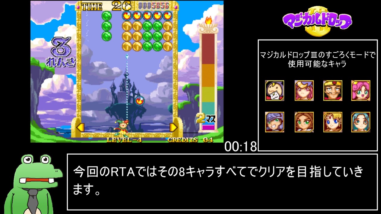 初投稿です(2年4か月ぶり)<br>誰やこんなRTA考え出した奴はよぉ!<br><br><br>全消しバグなど有利になるバグはすべて禁止してのプレイとなります。<br><br>計測区間:計測開始は1人目のキャラを選択した瞬間、計測終了は8人目のキャラでラスボスを倒した瞬間です。<br>使用ハード:PlayStation 4 Pro<br>使用コントローラー:リアルアーケードPro.V サイレントHAYABUSA<br><br>Part2:<a href="https://www.nicovideo.jp/watch/sm45586827" class="watch">sm45586827</a><br><br>過去動画<br>アケアカ版マジカルドロップⅢ すごろくモードRTA Any% Glitchless :<a href="https://www.nicovideo.jp/watch/sm41206117" class="watch">sm41206117</a><br>アケアカ版マジカルドロップⅢ Magical Journey(海外版すごろくモード)RTA:<a href="https://www.nicovideo.jp/watch/sm41619898" class="watch">sm41619898</a><br>アケアカ版マジカルドロップⅢ ひたすらモード(難易度ふつう)RTA Any% Glitchless:<a href="https://www.nicovideo.jp/watch/sm42363646" class="watch">sm42363646</a>