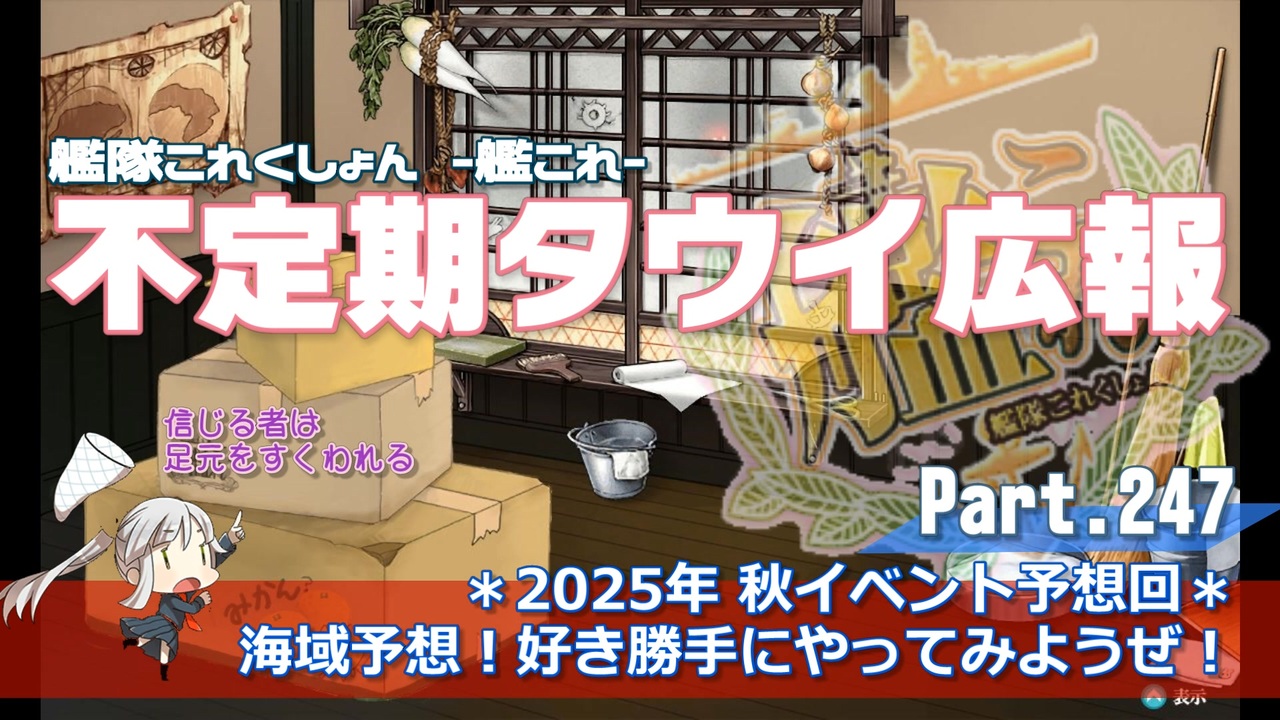 予想するイベントテーマは「撤退戦」!(元気な挨拶)<br><br>ということで、いつもの予想動画です。<br>今回はマジで情報が無いので当たるとか当たらないとか、もうそういうのは投げ捨てて好き勝手に予想を立てています。<br>縦逃げようと思っています。そういうことでどうぞよろしく!<br><br>『艦リミ2』もよろしくね!<br>専用サイト:<a href="https://sites.google.com/view/kan-limitfes?usp=sharing" target="_blank" rel="noopener nofollow">https://sites.google.com/view/kan-limitfes?usp=sharing</a><br><br><br>前回動画(Pt.246)をケケレ区民様、コパール様、yui@柱島様、SAM様、indy (indjpn)様、げん様、湯月様、noaniPM様、ガッツ様、叢雲提督様、さいぞう様、宵桜(ヨイザクラ)様、神在月様、六本線様、K-saku様、ゆう様、Hakamori様、サルトル様、あらはばき様、伊野様、ほうじcha様、ゆーきゅー様、三流提督様、高町提督様、風烈丸様、おさしみ様、<(゜∀。)様、六頁管理人様、jo様、K-SAKU様、totokaka様、<br>柳川様、おさけ様、<br>様から広告いただきました。ありがとうございます!<br><br>前:Part245> <a href="https://www.nicovideo.jp/watch/sm45504461" class="watch">sm45504461</a> 次:Part248> 秋イベE1の予定<br><br>みちしおせんせい動画一覧:<a href="https://www.nicovideo.jp/mylist/63943551" target="_blank" rel="noopener">mylist/63943551</a><br>動画一覧:<a href="https://www.nicovideo.jp/mylist/45380440" target="_blank" rel="noopener">mylist/45380440</a><br>X:<a href="https://twitter.com/nekomaruta_tawi" target="_blank" rel="noopener nofollow">https://twitter.com/nekomaruta_tawi</a>