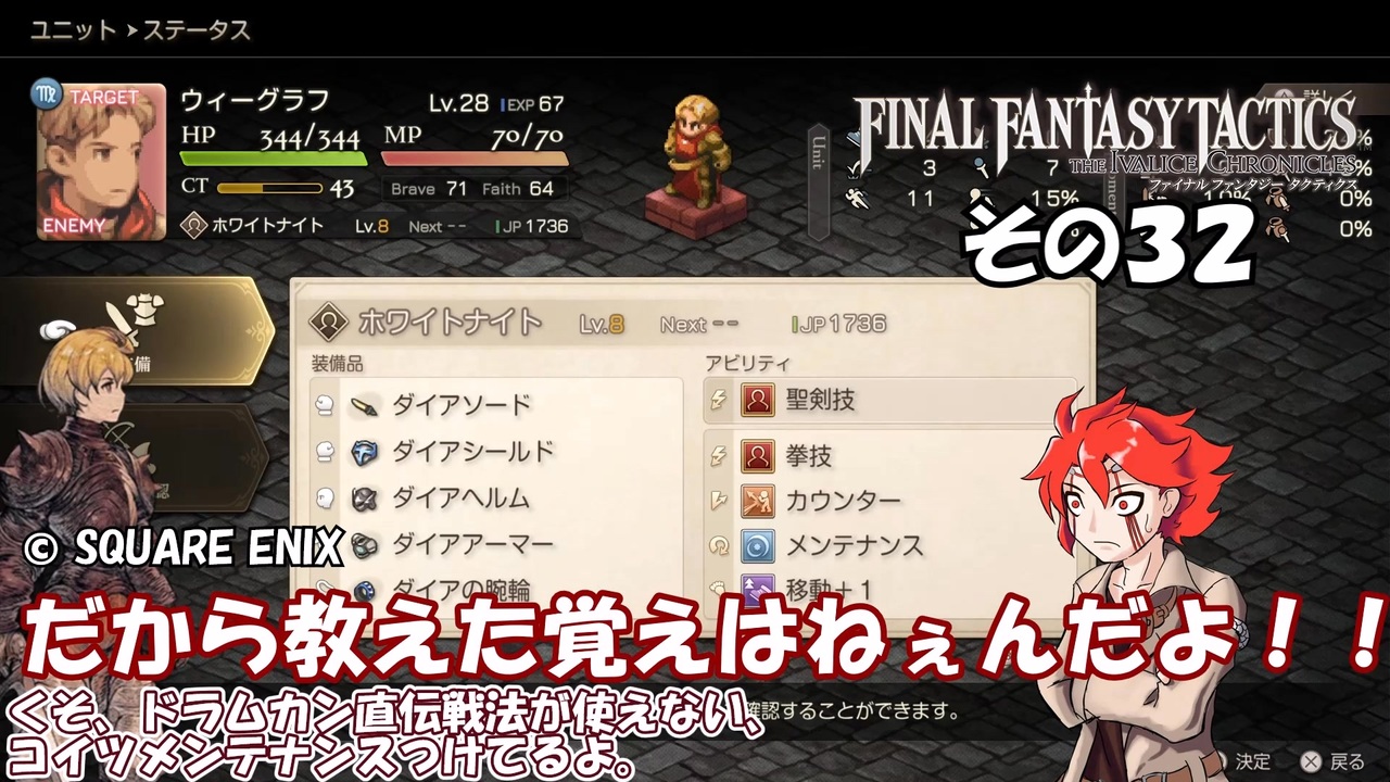 この動画はスチーム版ファイナルファンタジータクティクス イヴァリースクロニクルズの実況動画です。<br><br><br>難易度:タクティカル<br><br>※そのうち縛る縛り内容。<br>①ラムザくん 見習い戦士固定(まだいけてる)<br>②ネコ耳 斧or両手武器装備(両手持ちでもOK)<br>③ドラムカン 弓・ボウガン・銃装備<br>④きりたんです 武器攻撃禁止(たまに忘れる)<br>⑤あいちゃん 盾装備orサムラァイ<br><br><a href="https://www.nicovideo.jp/watch/sm45534581" class="watch">sm45534581</a> ← 前 次 → <a href="https://www.nicovideo.jp/watch/sm45540957" class="watch">sm45540957</a><br>マイリスト →<a href="https://www.nicovideo.jp/mylist/72149077" target="_blank" rel="noopener">mylist/72149077</a><br>その1リスト →<a href="https://www.nicovideo.jp/mylist/58364125" target="_blank" rel="noopener">mylist/58364125</a> <br><br>VOICEVOX:春日部つむぎ(ネコ耳) 玄野武宏(ラムザ・ベオルブ) 中部つるぎ(アグリアス様)<br> 青山龍星(ドラムカン) 東北きりたん(東北きりたん)<br> あいちゃん(中国うさぎ(立ち絵:akihiyo様作 立ち中国うさぎ素材 <a href="https://seiga.nicovideo.jp/seiga/im11211212" target="_blank" rel="noopener">im11211212</a>))<br>Voiceroid:東北きりたん(立ち絵:このりEX様作 東北きりたん立ち絵素材5 <a href="https://seiga.nicovideo.jp/seiga/im10819054" target="_blank" rel="noopener">im10819054</a>)<br><br>© SQUARE ENIX<br>