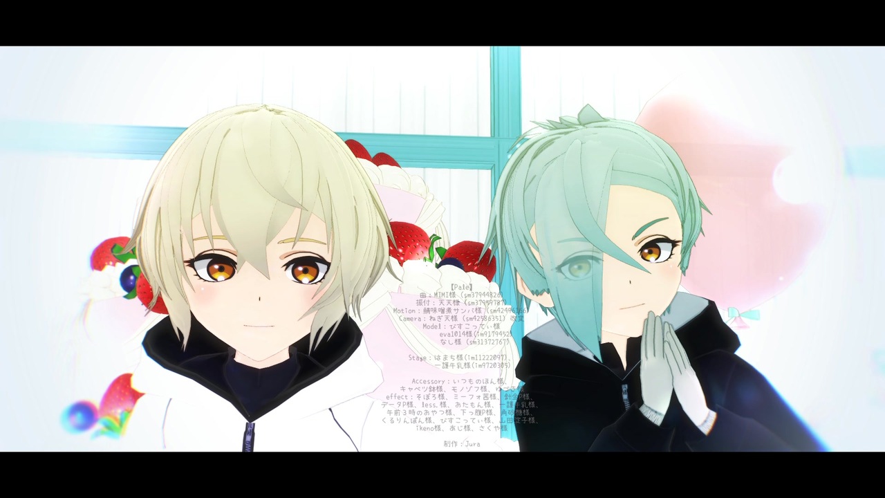 とってもかわいらしいモーションとカメラがあったので!<br><br>この子たちがうちに来てからだいたい1年<br>ということで、勝手にお祝い<br>うちに来てくれてありがとう~!<br><br>私も復活してから大体1年<br>まだ本調子ではないけれど、ちょっとづつちょっとづつ…<br><br>この1年、私の動画を見てくださり<br>コメントや、いいねをくださった方、<br>マイリストに入れてくださった方、本当にありがとうございました<(_ _)><br>自分の好きなものしか作れないけれど、<br>こんな私の作ったものでも見ていただけたらうれしいです<br><br>PC、この作品からWindows11になりました!<br>でも、使えなくなったものが色々と…なんで~😭<br><br>【Pale】<br>曲 :MIMI様 (<a href="https://www.nicovideo.jp/watch/sm37944826" class="watch">sm37944826</a>)<br>振付 :天天様 (<a href="https://www.nicovideo.jp/watch/sm37959787" class="watch">sm37959787</a>)<br>Motion :鯖味噌煮サンバ様(<a href="https://www.nicovideo.jp/watch/sm42496166" class="watch">sm42496166</a>)<br>Camera :ねぎ天様(<a href="https://www.nicovideo.jp/watch/sm42586351" class="watch">sm42586351</a>)改変<br>Model :びすこってぃ様<br> eva1014様(<a href="https://seiga.nicovideo.jp/seiga/im9179452" target="_blank" rel="noopener">im9179452</a>)<br> なし様(<a href="https://www.nicovideo.jp/watch/sm31372767" class="watch">sm31372767</a>)<br>Stage :はまち様(<a href="https://seiga.nicovideo.jp/seiga/im11222097" target="_blank" rel="noopener">im11222097</a>)、<br> 一護牛乳様(<a href="https://seiga.nicovideo.jp/seiga/im9720305" target="_blank" rel="noopener">im9720305</a>)<br>Accessory:いつものほん様、キャベツ鉢様、<br> モノゾフ様、ゆづき様<br>effect :そぼろ様、ミーフォ茜様、針金P様、<br> データP様、less.様、おたもん様、一護牛乳様、<br> 午前3時のおやつ様、下っ腹P様、角砂糖様、<br> くるりんぽん様、びすこってぃ様、山田淀子様、<br> ikeno様、あじ様、さくや様<br><br> 制作:Jura<br><br>ありがとうございました<(_ _)><br><br>転載等、配布者様にご迷惑のかかることは禁止です<(_ _)>