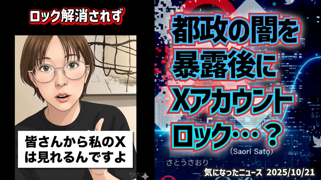 【出る杭は消し込む】◆さとうさおり都議、都政の闇を暴露後にアカウントロック…? 権力の圧力か、それとも“見えない力”か<br><br>あらすじ<br>東京都議会での発言が波紋を呼んでいます。<br>「東京都の消費税が20年以上未納で、それを1年以上隠していた」と指摘したさとうさおり都議。<br>その直後、週刊誌による中傷記事、そしてX(旧Twitter)アカウントのロック。<br>本人は「組織的にやられた」と語り、サブアカウントすらロックされる異常事態に。<br>今、ネット上では「言論封じでは?」との声が急速に広がっています。<br>本当に偶然なのか、それとも…。<br>“都政の闇”と“権力の影”をめぐる攻防、その真相に迫ります。<br><br>◆今回の台本(詳細)<a href="https://keiichiro8140.hatenablog.com/entry/25102111" target="_blank" rel="noopener nofollow">https://keiichiro8140.hatenablog.com/entry/25102111</a><br><br>◆もしも(BAN)の時のためのマイリンク集<a href="https://lit.link/K16_888" target="_blank" rel="noopener nofollow">https://lit.link/K16_888</a><br><br>ご覧いただきありがとうございます<br>m(_ _)m<br>気になったニュース 2025/10/21<br><br />著作権、肖像権に配慮して作成しております。<br><br>◆気になったニュースの台本!?<br>メモ代わりに作った台本をそのままあげてます<br><a href="https://keiichiro8140.hatenablog.com/." target="_blank" rel="noopener nofollow">https://keiichiro8140.hatenablog.com/.</a><br><br><br>ここからはシリーズ紹介<br><br><br>◆ ワクチン解毒・デトックス<br><a href="https://x.gd/fZweg" target="_blank" rel="noopener nofollow">https://x.gd/fZweg</a><br><br>◆ウイリアム・マキス博士のがん治療(イベルメクチン・フェンベンダゾール等)<br><a href="https://x.gd/AtFYS" target="_blank" rel="noopener nofollow">https://x.gd/AtFYS</a><br><br>◆予防接種健康被害救済制度<br><a href="https://x.gd/0xK9x" target="_blank" rel="noopener nofollow">https://x.gd/0xK9x</a><br><br>◆気になったニュース #1501~<br><br>◆ 【ショートver】気になったニュース<br><a href="https://x.gd/7MxXC" target="_blank" rel="noopener nofollow">https://x.gd/7MxXC</a><br><br>◆ 気になったニュース #1001~<br><a href="https://x.gd/Lp8gv" target="_blank" rel="noopener nofollow">https://x.gd/Lp8gv</a><br><br>◆ 気になったニュース #501~<br><a href="https://x.gd/EmbS4" target="_blank" rel="noopener nofollow">https://x.gd/EmbS4</a><br><br>◆ 気になったニュース #1~#500<br><a href="https://x.gd/uPhNb" target="_blank" rel="noopener nofollow">https://x.gd/uPhNb</a><br><br>◆ X(旧Twitter)・テレグラムで気になった情報<br><a href="https://x.gd/YG6FT" target="_blank" rel="noopener nofollow">https://x.gd/YG6FT</a><br><br>◆ 日比谷5万人パレードデ⚪生放送アーカイブ動画<br><a href="https://x.gd/3CHJv" target="_blank" rel="noopener nofollow">https://x.gd/3CHJv</a><br><br>◆日比谷5万人パレード⚪モのマイリスト作ってみました<br><a href="https://nico.ms/mylist/76828848?ref=sp_other" target="_blank" rel="noopener nofollow">https://nico.ms/mylist/76828848?ref=sp_other</a><br><br>◆3.30 令和の百姓⚪⚪<br><a href="https://www.nicovideo.jp/series/511791?ref=garage_share_other" target="_blank" rel="noopener nofollow">https://www.nicovideo.jp/series/511791?ref=garage_share_other</a><br><br>◆ 及川幸久さんの【XNEWS】シリーズ<br><a href="https://x.gd/3k78K" target="_blank" rel="noopener nofollow">https://x.gd/3k78K</a><br><br>◆これまでの動画<a href="https://x.gd/sPXoJ" target="_blank" rel="noopener nofollow">https://x.gd/sPXoJ</a><br><br>◆もしも(BAN)の時のためのマイリンク集<a href="https://lit.link/K-16_News44" target="_blank" rel="noopener nofollow">https://lit.link/K-16_News44</a><br><br>