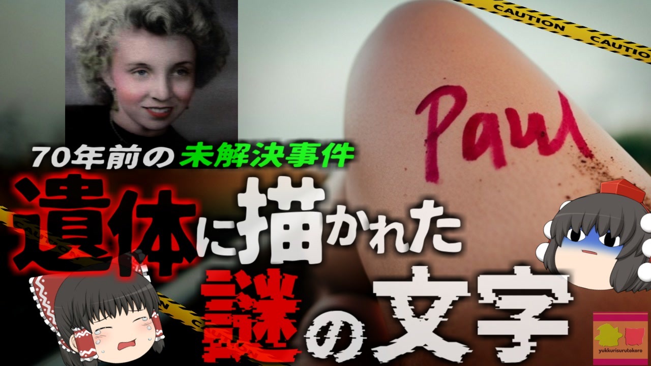 <a href="#" class="seekTime" data-seekTime="00:34" onclick="seekNicoPlayer('#00:34'); return false;">#00:34</a> 鉄道員が発見した遺体<br><a href="#" class="seekTime" data-seekTime="1:25" onclick="seekNicoPlayer('#1:25'); return false;">#1:25</a> 大人ではなく14歳の少女だった<br><a href="#" class="seekTime" data-seekTime="2:00" onclick="seekNicoPlayer('#2:00'); return false;">#2:00</a> 乱暴されてはいなかったが…<br><a href="#" class="seekTime" data-seekTime="2:43" onclick="seekNicoPlayer('#2:43'); return false;">#2:43</a> 「Paul」の文字<br><a href="#" class="seekTime" data-seekTime="3:44" onclick="seekNicoPlayer('#3:44'); return false;">#3:44</a> どんな少女だったのか<br><a href="#" class="seekTime" data-seekTime="5:11" onclick="seekNicoPlayer('#5:11'); return false;">#5:11</a> いくつかの目撃情報<br><a href="#" class="seekTime" data-seekTime="6:25" onclick="seekNicoPlayer('#6:25'); return false;">#6:25</a> 約300名以上を尋問<br><a href="#" class="seekTime" data-seekTime="7:55" onclick="seekNicoPlayer('#7:55'); return false;">#7:55</a> 容疑者<br><a href="#" class="seekTime" data-seekTime="9:06" onclick="seekNicoPlayer('#9:06'); return false;">#9:06</a> 迷宮入り<br><a href="#" class="seekTime" data-seekTime="9:45" onclick="seekNicoPlayer('#9:45'); return false;">#9:45</a> 事件が基となった映画も<br><br>引用・出展・参考文献(視聴者提供資料など<br>Wikipedia<br>Carolyn Wasilewski<br><a href="https://x.gd/L3P1y" target="_blank" rel="noopener nofollow">https://x.gd/L3P1y</a><br>John Waters <br><a href="https://x.gd/938om" target="_blank" rel="noopener nofollow">https://x.gd/938om</a><br><br />※この動画は過去の事件を知り、現在でも同じことが発生する危険性を再認識、関与しないように促すための動画であり、視聴者を扇動、動揺を誘うためのコンテンツではありません。<br><br>ご要望にお応えして、メンバーシップの開設を行いました。<br>下記URLからも登録可能ですので、ご興味がある方は是非ご参加ください。<br><a href="https://www.youtube.com/channel/UCcT5a1J7XJW7CLYI2RKl4pw/join" target="_blank" rel="noopener nofollow">https://www.youtube.com/channel/UCcT5a1J7XJW7CLYI2RKl4pw/join</a><br><br><br>Twitter<br>→<a href="https://twitter.com/yukkurisurutoko" target="_blank" rel="noopener nofollow">https://twitter.com/yukkurisurutoko</a><br><br>取り急ぎ、簡易的にですがマイリストを作りました。<br>【ゆっくり解説】事故・事件関係紹介リスト <br><a href="https://www.nicovideo.jp/mylist/71034319" target="_blank" rel="noopener nofollow">https://www.nicovideo.jp/mylist/71034319</a><br>【ゆっくり解説】放射線系事故<br><a href="https://www.nicovideo.jp/mylist/71034368" target="_blank" rel="noopener nofollow">https://www.nicovideo.jp/mylist/71034368</a><br>【ゆっくり解説】鉄道系事故・事件関連<br><a href="https://www.nicovideo.jp/mylist/71034379" target="_blank" rel="noopener nofollow">https://www.nicovideo.jp/mylist/71034379</a>