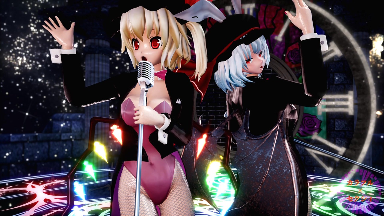 2人に踊ってもらいました。この作品は「東方project」の2次創作です。<br>現在、作成リクエストは受け付けていません。<br><br><br>【楽曲】:「カラフル×セクシィ」:SEGA feat. HATSUNE MIKU ちゃんねる様 <a href="https://www.nicovideo.jp/watch/1299574034" class="watch">watch/1299574034</a><br><br>【踊り】:しろねこ様・紫黒。様 <a href="https://www.nicovideo.jp/watch/sm17622347" class="watch">sm17622347</a><br><br>【モーション・カメラ】:なつき様 <a href="https://www.nicovideo.jp/watch/sm45130277" class="watch">sm45130277</a><br><br><br>■ステージ<br>「ロミオとシンデレラ」ステージ:ノーザンP 様 <a href="https://www.nicovideo.jp/watch/sm13166560" class="watch">sm13166560</a><br>逆光カーテンステージ:Ai 様 <a href="https://seiga.nicovideo.jp/seiga/im10943696" target="_blank" rel="noopener">im10943696</a><br><br>■モデル<br>フラン:すけ様<br>レミリア:J・クレイ様<br>衣装:島風バニー:HVP様 <a href="https://www.nicovideo.jp/watch/sm29804223" class="watch">sm29804223</a><br> 燕尾服ver2.0:黒鬼様 <a href="https://seiga.nicovideo.jp/seiga/im9543753" target="_blank" rel="noopener">im9543753</a>(女性用に改変)<br><br>■エフェクト<br>Ray-mmd-1.5.2:Rui様<br>初心者マテリアル:さらしな様<br>肌マテリアル:MARUSU様<br>AutoLuminous4:そぼろ様<br>水面エフェクト:ビームマンP様<br>空中に漂う埃:化身バレッタ様<br>ikBokeh_v020a:ikeno様<br>Ak魔法陣:あくろ様 <a href="https://seiga.nicovideo.jp/seiga/im5917642" target="_blank" rel="noopener">im5917642</a><br><br><br>MikuMikuDance:樋口優様<br>MMEffect :舞力介入P様<br>PMDE、PmxE:極北P様<br>AviUtl :KENくん様<br>・Aviutl + x264guiExでエンコード:rigaya様<br>Ut Video Codec Suite:ゆーむP様<br>上海アリス幻楽団・東方project(ZUN様)<br><br><br>mylist ③<a href="https://www.nicovideo.jp/mylist/75586824" target="_blank" rel="noopener">mylist/75586824</a> ② <a href="https://www.nicovideo.jp/mylist/72970530" target="_blank" rel="noopener">mylist/72970530</a> ① <a href="https://www.nicovideo.jp/mylist/63690967" target="_blank" rel="noopener">mylist/63690967</a> 旧 <a href="https://www.nicovideo.jp/mylist/61238351" target="_blank" rel="noopener">mylist/61238351</a><br><br> ※動画の転載は禁止です。<br>Attention,Unauthorized reproduction prohibited!!
