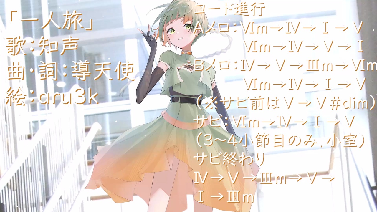 108作目です。<br>いつもお世話になっております。<br>血反吐するほどではありませんが、どうも爽やかな曲を作る技術は足りないようですね。<br><br>「一人旅」<br>歌:知声<br>曲・詞:導天使(<a href="https://x.com/subromup)" target="_blank" rel="noopener nofollow">https://x.com/subromup)</a><br>絵:aru3k(<a href="https://piapro.jp/t/99Ka)" target="_blank" rel="noopener nofollow">https://piapro.jp/t/99Ka)</a><br><br>-------------------------<br>最高な気分もあれば 最低な日に沈んだり<br>波のようにゆらめく日常もただ<br>雨粒より小さいことで 私がどこか変わってく<br>いいように捉えればそれは「可能性」だ<br>まだ何も知らないから<br>無地のキャンパスにも綺麗な色描ける<br>まだ何もできないから<br>できた喜び味わえるんだ<br><br>遠ざかってく慣れた町 <br>近づいてく「おはよう」<br>消え去ってく思い出を金に塗り替え<br>一歩二歩また進んでく<br>何もないとかあり得ないよ<br>行き先決めるの私 <br>「初めて」に手を出すときを刻む<br><br>毎日の繰り返しとか もう脳も衰えてんだ<br>答えあるパズル解いたって意味ないさ<br>すぐ動けるか動けないか<br>パターンⅡが妨げてる<br>破綻した論理を掲げ抗おう<br><br>生まれ持った不安は 気づけば大きく<br>一人ファミレスなんて 二回目怖くないね<br>まだ何も知らないから<br>パンチ一つだけで壊れる壁現る<br>まだ何もできないから<br>できた喜び味わえるんだ<br>遠ざかってく「できない」を重ねてく日常<br>消え去ってく不安すら思い出せず<br><br>遠ざかってく慣れた町 <br>近づいてく「おはよう」<br>消え去ってく思い出を金に塗り替え<br>一歩二歩また進んでく<br>すべてがプラスになるはず<br>行き先決めるの私 <br>「初めて」を選んでまた旅立つ<br><br>雨粒より小さいことで 私がどこか変わってく<br>いいように捉えればそれは「可能性」だ<br>すぐ動けるか動けないか<br>パターンⅡが妨げてる<br>破綻した論理を掲げ抗おう