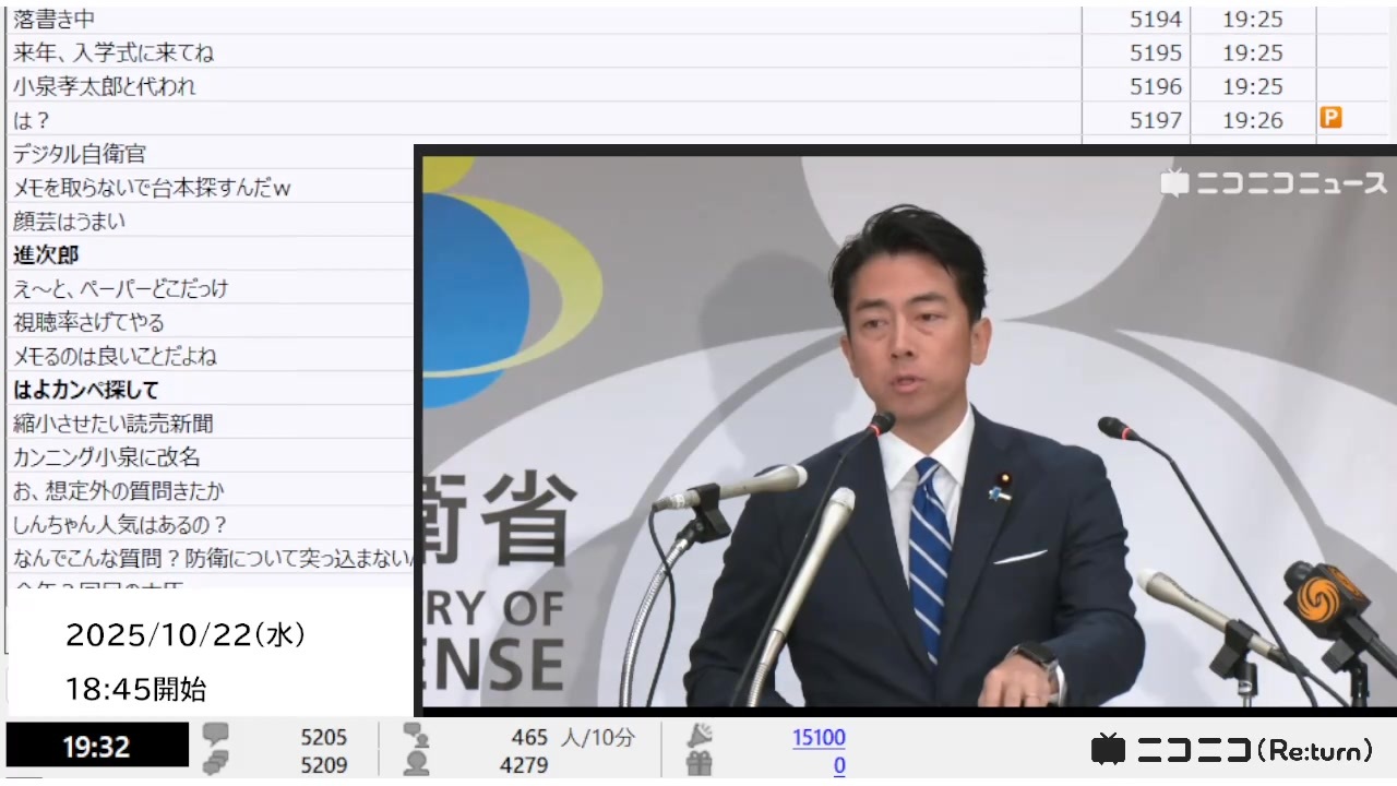 <a href="#" class="seekTime" data-seekTime="13:20" onclick="seekNicoPlayer('#13:20'); return false;">#13:20</a> 登場 会見スタート<br><a href="#" class="seekTime" data-seekTime="17:00" onclick="seekNicoPlayer('#17:00'); return false;">#17:00</a> 質疑応答<br><a href="#" class="seekTime" data-seekTime="23:25" onclick="seekNicoPlayer('#23:25'); return false;">#23:25</a> 七尾功(ニコニコ)の質問<br><a href="#" class="seekTime" data-seekTime="36:05" onclick="seekNicoPlayer('#36:05'); return false;">#36:05</a> 石井(共同通信)の質問<br><a href="#" class="seekTime" data-seekTime="63:10" onclick="seekNicoPlayer('#63:10'); return false;">#63:10</a> ニコ生アンケート<br><br>《高市新内閣》小泉進次郎 防衛大臣 就任記者会見 生中継<br>公式<br>2025/10/22(水) 18:45開始(58分)<br><br><a href="https://live.nicovideo.jp/watch/lv348999434" target="_blank" rel="noopener nofollow">https://live.nicovideo.jp/watch/lv348999434</a>
