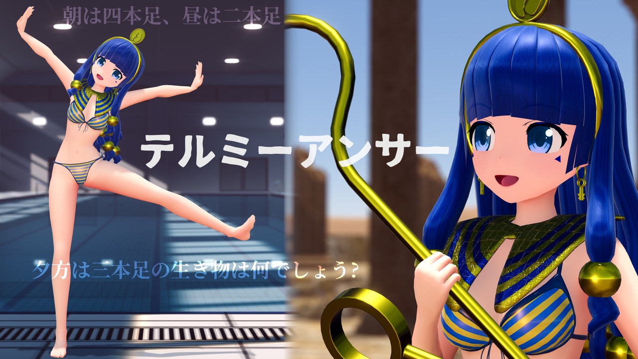 『東方錦上京』の新キャラ、馴子ちゃんが水着で踊ります。<br>動画の最初と最後にゲーム内のセリフを引用しております。<br>カメラは<a href="https://www.nicovideo.jp/watch/sm44070798" class="watch">sm44070798</a>で配布した自作データを流用しました。<br><br>『テルミーアンサー』<br>楽曲:キノシタ様 <a href="https://www.nicovideo.jp/watch/sm37405000" class="watch">sm37405000</a><br>振付:すぅねこ様 <a href="https://www.nicovideo.jp/watch/sm37995253" class="watch">sm37995253</a><br>トレース元:愛川こずえ様 <a href="https://www.nicovideo.jp/watch/sm38933162" class="watch">sm38933162</a><br>ダンスモーション:なつき様 <a href="https://www.nicovideo.jp/watch/sm39512992" class="watch">sm39512992</a><br><br>「どうせなら命を賭けて謎を解け」(『東方錦上京』より)<br>作曲:ZUN様<br>アレンジ:あむにゃっく様 <a href="https://commons.nicovideo.jp/works/nc419828" target="_blank" rel="noopener">nc419828</a><br><br>道神馴子:Moonbinder様 <a href="https://bowlroll.net/file/336781" target="_blank" rel="noopener nofollow">https://bowlroll.net/file/336781</a><br>榛名 私服 (瞳テクスチャのみ使用):アールビット様 <a href="https://seiga.nicovideo.jp/seiga/im10787908" target="_blank" rel="noopener">im10787908</a><br><br>モブ砂漠:モノゾフ様 <a href="https://seiga.nicovideo.jp/seiga/im3731669" target="_blank" rel="noopener">im3731669</a><br>遺跡風ステージ:ゆづき様 <a href="https://seiga.nicovideo.jp/seiga/im9294134" target="_blank" rel="noopener">im9294134</a><br>ピラミッドと砂漠:ばんぞく様 <a href="https://seiga.nicovideo.jp/seiga/im11161250" target="_blank" rel="noopener">im11161250</a><br>温水プール:ムムム様 <a href="https://seiga.nicovideo.jp/seiga/im11225329" target="_blank" rel="noopener">im11225329</a><br><br />クレジットの詳細は動画の最後に記載しています。<br>また利用したものは可能な限りコンテンツツリーに登録致します。