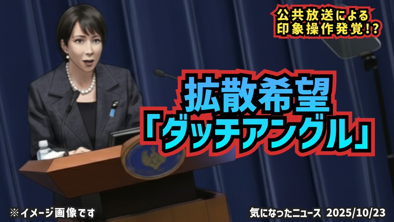 【拡散希望】◆ご存知ですか?『ダッチアングル』~ メディアの印象操作 ~ 高市潰しが始まった!?<br><br>NHKのニュースで放送された高市総理の映像が「斜め」に映されていたことが話題に。映像技法の一つ「ダッチアングル」は、見る人に不安や緊張を与える効果があるとされます。本来は映画などで使われる手法で、政治報道での使用は極めて異例。これが偶然か意図的か――。国民のための政策を冷静に評価すべき時に、公共放送が印象操作とも取れる映像表現を用いることは、公平な報道の在り方そのものを問う問題です。SNSでは「報道ではなく誘導では?」との声も高まっています。<br><br>◆今回の台本(詳細)<a href="https://keiichiro8140.hatenablog.com/entry/25102333222" target="_blank" rel="noopener nofollow">https://keiichiro8140.hatenablog.com/entry/25102333222</a><br><br>◆これまでの動画<a href="https://sp.nicovideo.jp/user/17408518/video?sortKey=registeredAt&sortOrde" target="_blank" rel="noopener nofollow">https://sp.nicovideo.jp/user/17408518/video?sortKey=registeredAt&sortOrde</a><br><br>◆もしも(BAN)の時のためのマイリンク集<a href="https://lit.link/K16_888" target="_blank" rel="noopener nofollow">https://lit.link/K16_888</a><br><br>ご覧いただきありがとうございます<br>m(_ _)m<br>気になったニュース 2025/10/23<br><br />著作権、肖像権に配慮して作成しております。<br><br>◆気になったニュースの台本!?<br>メモ代わりに作った台本をそのままあげてます<br><a href="https://keiichiro8140.hatenablog.com/." target="_blank" rel="noopener nofollow">https://keiichiro8140.hatenablog.com/.</a><br><br><br>ここからはシリーズ紹介<br><br><br>◆ ワクチン解毒・デトックス<br><a href="https://x.gd/fZweg" target="_blank" rel="noopener nofollow">https://x.gd/fZweg</a><br><br>◆ウイリアム・マキス博士のがん治療(イベルメクチン・フェンベンダゾール等)<br><a href="https://x.gd/AtFYS" target="_blank" rel="noopener nofollow">https://x.gd/AtFYS</a><br><br>◆予防接種健康被害救済制度<br><a href="https://x.gd/0xK9x" target="_blank" rel="noopener nofollow">https://x.gd/0xK9x</a><br><br>◆気になったニュース #1501~<br><br>◆ 【ショートver】気になったニュース<br><a href="https://x.gd/7MxXC" target="_blank" rel="noopener nofollow">https://x.gd/7MxXC</a><br><br>◆ 気になったニュース #1001~<br><a href="https://x.gd/Lp8gv" target="_blank" rel="noopener nofollow">https://x.gd/Lp8gv</a><br><br>◆ 気になったニュース #501~<br><a href="https://x.gd/EmbS4" target="_blank" rel="noopener nofollow">https://x.gd/EmbS4</a><br><br>◆ 気になったニュース #1~#500<br><a href="https://x.gd/uPhNb" target="_blank" rel="noopener nofollow">https://x.gd/uPhNb</a><br><br>◆ X(旧Twitter)・テレグラムで気になった情報<br><a href="https://x.gd/YG6FT" target="_blank" rel="noopener nofollow">https://x.gd/YG6FT</a><br><br>◆ 日比谷5万人パレードデ⚪生放送アーカイブ動画<br><a href="https://x.gd/3CHJv" target="_blank" rel="noopener nofollow">https://x.gd/3CHJv</a><br><br>◆日比谷5万人パレード⚪モのマイリスト作ってみました<br><a href="https://nico.ms/mylist/76828848?ref=sp_other" target="_blank" rel="noopener nofollow">https://nico.ms/mylist/76828848?ref=sp_other</a><br><br>◆3.30 令和の百姓⚪⚪<br><a href="https://www.nicovideo.jp/series/511791?ref=garage_share_other" target="_blank" rel="noopener nofollow">https://www.nicovideo.jp/series/511791?ref=garage_share_other</a><br><br>◆ 及川幸久さんの【XNEWS】シリーズ<br><a href="https://x.gd/3k78K" target="_blank" rel="noopener nofollow">https://x.gd/3k78K</a><br><br>◆これまでの動画<a href="https://x.gd/sPXoJ" target="_blank" rel="noopener nofollow">https://x.gd/sPXoJ</a><br><br>◆もしも(BAN)の時のためのマイリンク集<a href="https://lit.link/K-16_News44" target="_blank" rel="noopener nofollow">https://lit.link/K-16_News44</a><br><br>