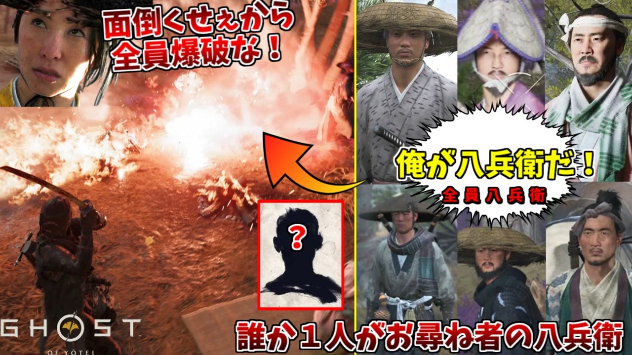 八兵衛の首に懸賞金がかかってるから、全員八兵衛なら全員処すしかない。<br><br>前回→<a href="https://www.nicovideo.jp/watch/sm45537150" class="watch">sm45537150</a> 次回→<a href="https://www.nicovideo.jp/watch/sm45563027" class="watch">sm45563027</a><br><br>パート1→<a href="https://www.nicovideo.jp/watch/sm45482416" class="watch">sm45482416</a><br><br>ツシマ本編パート1→<a href="https://www.nicovideo.jp/watch/sm37221927" class="watch">sm37221927</a> ツシマDLC編パート1→<a href="https://www.nicovideo.jp/watch/sm39221633" class="watch">sm39221633</a><br><br><span style="color: #000000; font-size: 14px;">【ゴーストオブツシマ マイリスト】<a href="https://www.nicovideo.jp/mylist/68993148" target="_blank" rel="noopener">mylist/68993148</a></span><br><span style="color: #000000;">【チャンネル】</span><span style="color: #006699; font-size: 14px;"><a href="https://ch.nicovideo.jp/ainosensi" target="_blank" rel="noopener">ch.nicovideo.jp/ainosensi</a></span><br><span style="color: #000000; font-size: 14px;">【その他投稿作品】</span><span style="color: #006699; font-size: 14px;"><a href="https://www.nicovideo.jp/mylist/34427287" target="_blank" rel="noopener">mylist/34427287</a></span><span style="color: #000000; font-size: 14px;"> 【Twitter】@ainosensi2</span><br><span style="color: #14171a; font-size: 14px;">【YOUTUBE】</span><span style="color: #006699; font-size: 14px;"><a href="http://goo.gl/OMphlA" target="_blank" rel="noopener nofollow">http://goo.gl/OMphlA</a></span>