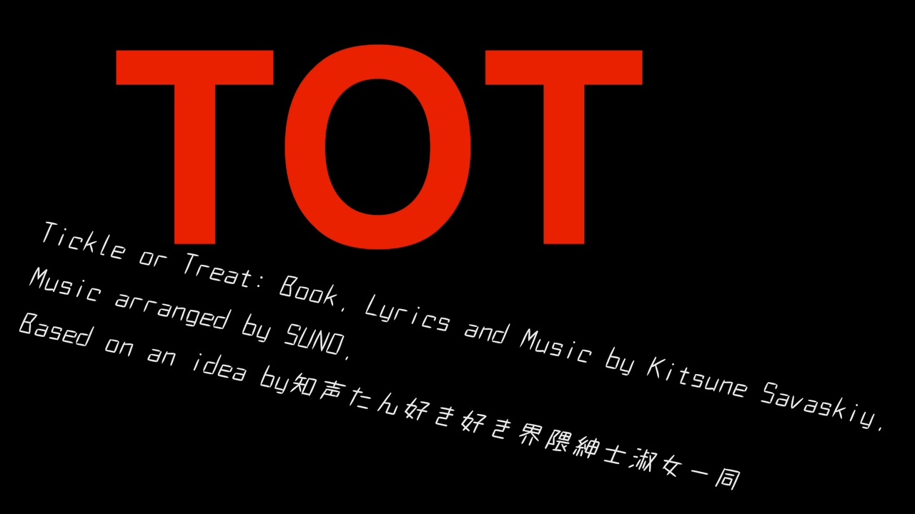 #闇ボカロPの爽やか血反吐祭 参加曲!!!<br>普段闇属性の曲を作りがちな妖狐のきつねが、全力でめっちゃ明るい曲を作ったよ!ちょっと大人向けなミュージカルって感じかな🦊ピューピュー<br><br>シナリオはちせーたん好き好き界隈の紳士淑女の皆様の叡智なアイディアを頂き、きつねが全力で書き上げました📒<br>ほら、ちょうどハロウィンだコンぞ🎃👻お菓子をくれなきゃくすぐっちゃうぞ〜そしてお菓子をくれても...<br>君がっ!泣くまでっ!くすぐるのをやめない!!<br><br>✄--------------------------------‐✄<br>タイトル:TOT(Tickle or Treat)<br>脚本: 🦊 with ちせーたん好き好き界隈一同<br>演出/作曲:🦊、編曲:SUNO<br><a href="https://x.com/KitsuneSavaskiy" target="_blank" rel="noopener nofollow">https://x.com/KitsuneSavaskiy</a><br>◆主演<br>・ゆうしゃ 知声<br>・女幹部 狐子<br>・語り部 ゆっくり(棒読みちゃん)<br><br>🔸絵葉書/ビデオレター コラボ<br>- イエロー様 <br><a href="https://x.com/A_M_tomato" target="_blank" rel="noopener nofollow">https://x.com/A_M_tomato</a><br>- チアキ・ニックドール様 <br><a href="https://x.com/rougoshikin2000" target="_blank" rel="noopener nofollow">https://x.com/rougoshikin2000</a><br>- はこだけスタジオ様 <br><a href="https://x.com/Hakodake_STUDIO" target="_blank" rel="noopener nofollow">https://x.com/Hakodake_STUDIO</a><br>- 雪(白)月花様 <br><a href="https://x.com/setugetukapapa" target="_blank" rel="noopener nofollow">https://x.com/setugetukapapa</a><br>- ワダキナノ様 <br><a href="https://x.com/VadaQuinano" target="_blank" rel="noopener nofollow">https://x.com/VadaQuinano</a><br>- カトルっち様 <br><a href="https://x.com/jinro108" target="_blank" rel="noopener nofollow">https://x.com/jinro108</a><br>...他知世たん好き好き界隈紳士淑女一同<br>皆さん素敵なコラボありがとコンコンです🦊🙌<br><br>✄--------------------------------‐✄<br><br>Xの本作投稿ツリー🌲<br>こっちにもコメントくれると嬉しいコン<br><a href="https://x.com/kitsunesavaskiy/status/1981379493756621029?s=46" target="_blank" rel="noopener nofollow">https://x.com/kitsunesavaskiy/status/1981379493756621029?s=46</a><br><br>🎥前回のお話<br><a href="https://www.nicovideo.jp/watch/sm45452580" target="_blank" rel="noopener nofollow">https://www.nicovideo.jp/watch/sm45452580</a><br><br>歌コレ踊コレOKだお(`・ω・´)キリッ<br><br><br>⬅️第三話 鋭意制作中🦊<br><br><br>➡️第一話🐮<br><a href="https://nico.ms/sm45452580" target="_blank" rel="noopener nofollow">https://nico.ms/sm45452580</a>