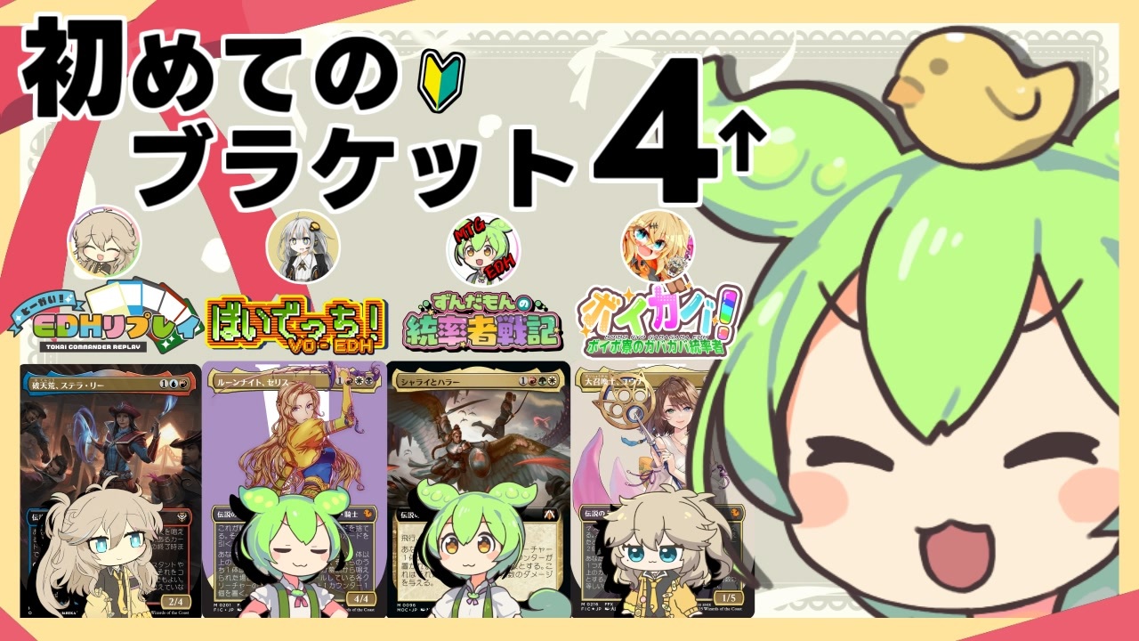 ブラケット4↑の対戦コラボなのだ!<br>いつもと違ったレベルの戦いをお楽しみ下さい!<br>カード参考価格は晴れる屋様より<br>┈┈┈┈┈┈┈┈┈┈┈┈┈┈┈┈┈┈┈┈┈┈┈┈┈┈┈┈┈┈<br>▼デッキリスト<br>ずんとう(シャライとハラー)<br><a href="https://www.hareruyamtg.com/decks/1102011" target="_blank" rel="noopener nofollow">https://www.hareruyamtg.com/decks/1102011</a><br>うらがー(ルーンナイト、セリス)<br><a href="https://www.hareruyamtg.com/decks/1102037?display_token=10d0d5.91306acf318f42" target="_blank" rel="noopener nofollow">https://www.hareruyamtg.com/decks/1102037?display_token=10d0d5.91306acf318f42</a><br>えつじ(ステラ・リー)<br><a href="https://www.hareruyamtg.com/decks/1131094" target="_blank" rel="noopener nofollow">https://www.hareruyamtg.com/decks/1131094</a><br>湯たんぽ(大召喚士、ユウナ)<br><a href="https://www.hareruyamtg.com/decks/1099328?view=gridview&display_token=10c640.698a7cf7fad210" target="_blank" rel="noopener nofollow">https://www.hareruyamtg.com/decks/1099328?view=gridview&display_token=10c640.698a7cf7fad210</a><br>┈┈┈┈┈┈┈┈┈┈┈┈┈┈┈┈┈┈┈┈┈┈┈┈┈┈┈┈┈┈<br>▼Booth<br><a href="https://edhzunda.booth.pm" target="_blank" rel="noopener nofollow">https://edhzunda.booth.pm</a><br>▼X<br><a href="https://x.com/EDH_Zunda" target="_blank" rel="noopener nofollow">https://x.com/EDH_Zunda</a><br>▼Youtubeにも投稿しております。<br><a href="https://youtu.be/c4S8WchjoIs" target="_blank" rel="noopener nofollow">https://youtu.be/c4S8WchjoIs</a><br>┈┈┈┈┈┈┈┈┈┈┈┈┈┈┈┈┈┈┈┈┈┈┈┈┈┈┈┈┈┈<br>■MTG動画会 Discordサーバー<br>MTG動画投稿者同士で情報共有や助け合うことを目的としたコミュニティです。<br>招待URL:<a href="https://discord.gg/2U2wtFXMeg" target="_blank" rel="noopener nofollow">https://discord.gg/2U2wtFXMeg</a><br>┈┈┈┈┈┈┈┈┈┈┈┈┈┈┈┈┈┈┈┈┈┈┈┈┈┈┈┈┈┈<br>▼使用させていただいた素材<br>キャラクター…VOICEVOX(ずんだもん/四国めたん/春日部つむぎ)/A.I.VOICE Editor2(結月ゆかりNV)<br>キャラクター立ち絵…坂本アヒル様<br>背景画像…OKUMONO様/いらすとや様<br>BGM… 動画内に記載<br>SE…On-Jin ~音人~様/効果音ラボ様<br><br>▼著作権等に関する表記<br>「ずんだもんの統率者戦記」はファンコンテンツ・ポリシーに沿った非公式のファンコンテンツです。<br>ウィザーズ社の認可/許諾は得ていません。題材の一部に、ウィザーズ・オブ・ザ・コースト社の財産を含んでいます。©Wizards of the Coast LLC."