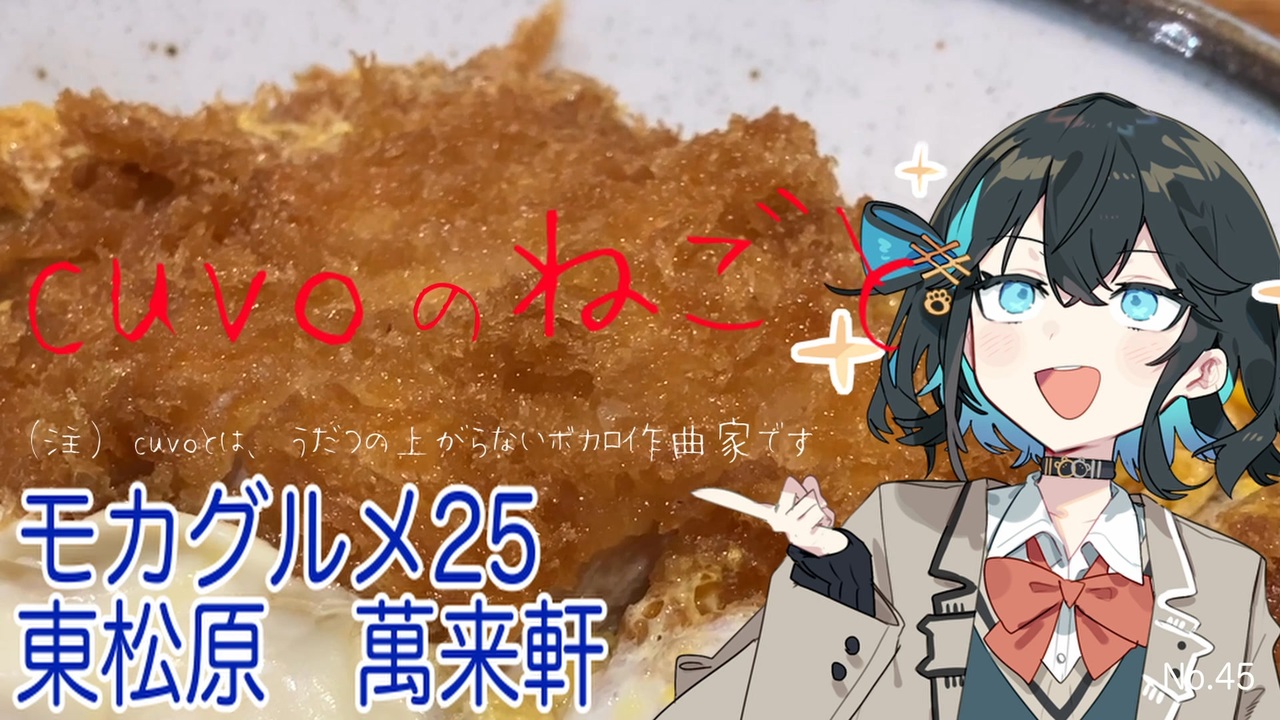 こんにちは!<br>cuvoのねごと、第45回です!<br><br>シリーズ「モカグルメ」の<br>第25弾をお届けします!<br><br>今回は東松原にある<br>萬来軒に行ってきました<br><br>長い間、車窓から見続けたお店に<br>ようやく行くことができました<br><br>町中華のカツ丼、美味しかったです!<br><br>「これが至福ってやつですかぁ!」<br><br>気になった方は、ぜひ行ってみてくださいね!<br><br>ーーーーーーー<br>▼Xで発信中!cuvoのねごと<br><a href="https://twitter.com/cuvo_jpn" target="_blank" rel="noopener nofollow">https://twitter.com/cuvo_jpn</a><br><br><br>▼エンディングテーマ<br>「飲みに行こう」<br>曲:cuvo / 詞:vie<br>歌:seven(neutrino)<br><br>↓ニコ動<br><a href="https://nico.ms/sm41946436" target="_blank" rel="noopener nofollow">https://nico.ms/sm41946436</a><br><br>↓YouTube<br><a href="https://youtu.be/aJWyRuT7cGk" target="_blank" rel="noopener nofollow">https://youtu.be/aJWyRuT7cGk</a><br><br>ーーーーーーーーーーーーーーーーー<br><br />ニコニコ動画(cuvo:ボカロ曲)<br><a href="https://www.nicovideo.jp/user/123099454/video" target="_blank" rel="noopener nofollow">https://www.nicovideo.jp/user/123099454/video</a><br><br>YouTube<br><a href="https://www.youtube.com/channel/UCeyFWGAsM1u0r7XpT0yeDPA/" target="_blank" rel="noopener nofollow">https://www.youtube.com/channel/UCeyFWGAsM1u0r7XpT0yeDPA/</a><br><br>X(旧Twitter)<br><a href="https://twitter.com/cuvo_jpn" target="_blank" rel="noopener nofollow">https://twitter.com/cuvo_jpn</a><br><br>Instagram<br><a href="https://www.instagram.com/cuvo_jpn/" target="_blank" rel="noopener nofollow">https://www.instagram.com/cuvo_jpn/</a>