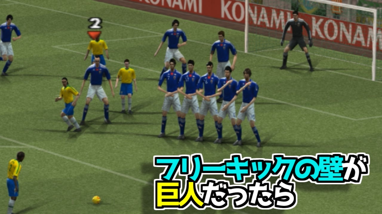 巨人でフリーキックの壁を作ってブラジルを絶望させてほしいと言う意見がありましたので、やってみました。<br>前回からの続きで、改造日本代表対ブラジル代表戦の続きです。<br><br>なお、動画の作成にあたりウイイレ(現イーフト)2010を改造しています。<br><br><br>なお、この動画はツールアシスト(エミュレータ上でプレイし、どこでもセーブ、スローモーション機能などを利用)して作成されています。<br><br>・その他のおすすめ動画<br>【改造ウイイレ】当たれば転ぶマリーシアカップ決勝→<a href="https://www.nicovideo.jp/watch/sm41680868" class="watch">sm41680868</a><br>【改造ウイイレ】ウイイレのジャンプ力を検証【イカサマイレブン】→<a href="https://www.nicovideo.jp/watch/sm41712035" class="watch">sm41712035</a><br>【改造ウイイレ】日本VSアメリカ お相撲さんワールドカップ決勝→<a href="https://www.nicovideo.jp/watch/sm41779491" class="watch">sm41779491</a><br>キリンカップ決勝 中国VS北朝鮮 【改造ウイイレ】→<a href="https://www.nicovideo.jp/watch/sm41813208" class="watch">sm41813208</a><br>ウイイレでネットを突き破るには時速何キロ必要?【TAS】→<a href="https://www.nicovideo.jp/watch/sm41848503" class="watch">sm41848503</a><br><br><br />動画に「いいね!」「マイリスト登録」よろしくお願いします。<br><br>・おすすめ<br>[TAS]Grand Theft Auto 3 Part1→<a href="https://www.nicovideo.jp/watch/sm14718961" class="watch">sm14718961</a><br>[TAS]MaxPayne デッドターゲット Part1→<a href="https://www.nicovideo.jp/watch/sm15093299" class="watch">sm15093299</a><br>[TAS]michigan Part1→<a href="https://www.nicovideo.jp/watch/sm18393230" class="watch">sm18393230</a><br><br>サポート頂けると励みになります<br>魔界塔士のサポーターになる→<a href="https://creator-support.nicovideo.jp/registration/15153622" target="_blank" rel="noopener nofollow">https://creator-support.nicovideo.jp/registration/15153622</a><br><br>TAS動画まとめ→<a href="https://koeiprogenitor.com/tas/matome/" target="_blank" rel="noopener nofollow">https://koeiprogenitor.com/tas/matome/</a><br>つべ→<a href="https://www.youtube.com/user/koeiprogenitor1/" target="_blank" rel="noopener nofollow">https://www.youtube.com/user/koeiprogenitor1/</a><br>インスタ→<a href="https://www.instagram.com/makaitoshi" target="_blank" rel="noopener nofollow">https://www.instagram.com/makaitoshi</a><br><br>本編→シリーズ一覧見てね<br>