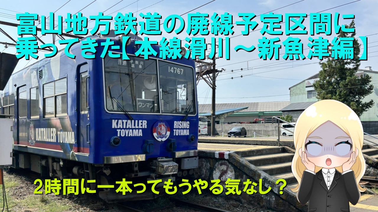地鉄廃線予定区間に乗ってきた動画、後編は地鉄本線滑川~新魚津間をご紹介。前編に引き続き内容はスカスカなので大した期待はしないで下さい。あとしれっと廃線予定区間が増えてしまったので、そのうち追加でもう一回出す予定です。 <br><br>前回の動画はこちら→<a href="https://www.nicovideo.jp/watch/sm45436227" class="watch">sm45436227</a><br>電鉄魚津駅についてはこちらもどうぞ→<a href="https://www.nicovideo.jp/watch/nm20665946" class="watch">nm20665946</a> <a href="https://www.nicovideo.jp/watch/nm20767559" class="watch">nm20767559</a><br /><span style="color: #000000; font-size: 14px;">迷航空会社列伝</span><span style="color: #006699; font-size: 14px;"><a href="https://www.nicovideo.jp/mylist/24098760" target="_blank" rel="noopener">mylist/24098760</a></span><span style="color: #000000; font-size: 14px;"> 迷列車北陸編</span><span style="color: #006699; font-size: 14px;"><a href="https://www.nicovideo.jp/mylist/19084652" target="_blank" rel="noopener">mylist/19084652</a> </span><span style="color: #000000; font-size: 14px;">東海道交通戦争</span><span style="color: #006699; font-size: 14px;"><a href="https://www.nicovideo.jp/mylist/57958388" target="_blank" rel="noopener">mylist/57958388</a></span><span style="color: #000000; font-size: 14px;"> 交通機関の栄枯盛衰 </span><a href="https://www.nicovideo.jp/mylist/66898301" target="_blank" rel="noopener">mylist/66898301</a><br><span style="color: #000000; font-size: 14px;">ブログ→</span><span style="color: #006699; font-size: 14px;"><a href="http://www.meihokuriku-alps.com" target="_blank" rel="noopener nofollow">http://www.meihokuriku-alps.com</a></span><br>note→<a href="https://note.com/meihokuriku" target="_blank" rel="noopener nofollow">https://note.com/meihokuriku</a><br><span style="color: #000000; font-size: 14px;">使用BGM<br>甘茶の音楽工房様 </span><span style="color: #006699; font-size: 14px;"><a href="http://amachamusic.chagasi.com/index.html" target="_blank" rel="noopener nofollow">http://amachamusic.chagasi.com/index.html</a></span><br><span style="color: #000000; font-size: 14px;">魔王魂様 </span><span style="color: #006699; font-size: 14px;"><a href="https://maoudamashii.jokersounds.com/list/bgm5.html" target="_blank" rel="noopener nofollow">https://maoudamashii.jokersounds.com/list/bgm5.html</a></span>