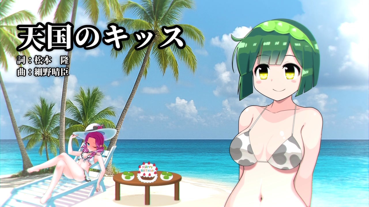 <span style="color: #38761d;"><strong>ずん子さん、お誕生日おめでとうございます!</strong></span><br>東北ずん子さんに歌ってもらいました。v3.0.4<br>コーラスは四国めたんさん。<br>めたんで途中まで作りかけていた物をボーカル変更してお誕生日用に作成しました。<br><br>天国のキッス / 松田聖子 1983年(昭和58年)<br>作詞:松本 隆<br>作曲:細野 晴臣<br><br>◇お借りしたもの<br>MIDI:ヤマハミュージックデータショップ様 <a href="https://yamahamusicdata.jp/" target="_blank" rel="noopener nofollow">https://yamahamusicdata.jp/</a><br>東北ずん子立ち絵:moiky様 <a href="https://seiga.nicovideo.jp/seiga/im11636950" target="_blank" rel="noopener">im11636950</a><br>四国めたんイラスト:ずんずんPJ公式様 <a href="https://zunko.jp/" target="_blank" rel="noopener nofollow">https://zunko.jp/</a><br>水滴のフレーム:ozu様 <a href="https://commons.nicovideo.jp/works/nc411159" target="_blank" rel="noopener">nc411159</a><br>丸テーブル・机・ちゃぶ台:hikarururu様 <a href="https://commons.nicovideo.jp/works/nc224756" target="_blank" rel="noopener">nc224756</a><br>カラフル(パステル)紙吹雪:hikarururu様 <a href="https://commons.nicovideo.jp/works/nc265915" target="_blank" rel="noopener">nc265915</a><br>ケーキ、ずんだ餅:いらすとや様 <a href="https://www.irasutoya.com/" target="_blank" rel="noopener nofollow">https://www.irasutoya.com/</a><br><br><a target="_blank" href="https://qa.nicovideo.jp/faq/show/19424?site_domain=default" style="font-size: 13px;color: #657586; text-decoration: underline; line-height: 1.4">この動画は投稿者によって修正されました</a>