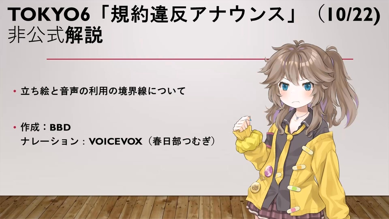 2025年10月22日、TOKYO6公式アカウントが発表した<br> 「弊社キャラクターの立ち絵に、他の音声合成ソフトの音声を当てている動画がございます。<br> このような使い方は規約的にNGとなります。」<br> という投稿が話題になりました。<br>本動画では、このアナウンスの背景・根拠となるガイドラインの部分”について、<br> 非公式に解説します。<br><br>クレジット<br>VOICEVOX:春日部つむぎ<br>使用画像等<br>TOKYO6アカウント<br>TOKYO6 Information @tokyo6info<br>キャラクター使用ガイドライン<br><a href="https://tokyo6.tokyo/guidelines/" target="_blank" rel="noopener nofollow">https://tokyo6.tokyo/guidelines/</a><br><br>個人利用許諾範囲<br>CeVIO AI<br><a href="https://www.ah-soft.com/commercial/cevio/private/" target="_blank" rel="noopener nofollow">https://www.ah-soft.com/commercial/cevio/private/</a><br>VOICEPEAK<br><a href="https://www.ah-soft.com/commercial/voicepeak/private/" target="_blank" rel="noopener nofollow">https://www.ah-soft.com/commercial/voicepeak/private/</a><br>VoiSona Talk<br><a href="https://www.ah-soft.com/commercial/voisona-talk/private/" target="_blank" rel="noopener nofollow">https://www.ah-soft.com/commercial/voisona-talk/private/</a><br><br>動画作成<br>YMM4<br>使用立ち絵<br>春日部つむぎ・立ち絵素材データ(PSD・PNG)/大淀久明<br><a href="https://booth.pm/ja/items/4502492?srsltid=AfmBOoo9VlPt3RXbcc_Pps4XhdrjdZpsnLwB1IVLc7OAdcyRH24BTs-3" target="_blank" rel="noopener nofollow">https://booth.pm/ja/items/4502492?srsltid=AfmBOoo9VlPt3RXbcc_Pps4XhdrjdZpsnLwB1IVLc7OAdcyRH24BTs-3</a><br>文章作成補助<br>ChatGPT<br>