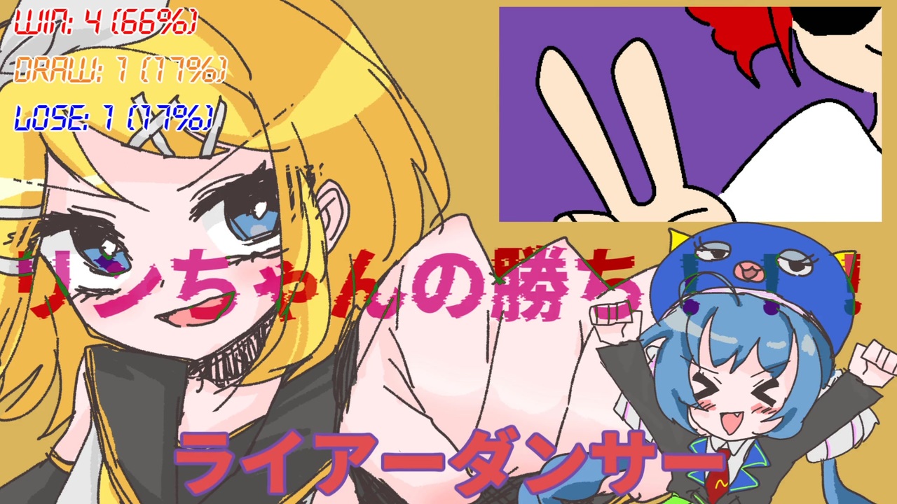 <strong>リンちゃんが有名ボカロ曲に勝ちたいようです。</strong><br><br>思い立って2日でとんでもない曲が出来てしまいました、本当にごめんなさい<br>今回からnaolumeさんが本格的に協力してくれたよ!<br><br>#闇ボカロPの爽やか血反吐祭 ・ #小室進行ボカロ曲投稿祭2025秋 参加曲です!<br><br>作詞:み(naolume・MidLuster)<br>作曲:み(MidLuster)<br>絵:み(MidLuster・naolume・平賀なのみ・ダ王P)・アルセチカ様 <a href="https://x.com/aruseee" target="_blank" rel="noopener nofollow">https://x.com/aruseee</a><br>動画:み(ダ王P)<br>唄:鏡音リン・音街ウナ<br>誘った人:み(平賀なのみ)<br>誘われた人:み(naolume)<br>じゃんけん始めた人:み(平賀なのみ)<br><br>Special Sorry:いろんな有名ボカロ曲<br>メズマライザー <a href="https://www.nicovideo.jp/watch/sm43708803" class="watch">sm43708803</a><br>混沌ブギ <a href="https://www.nicovideo.jp/watch/sm42682989" class="watch">sm42682989</a><br>テトリス <a href="https://www.nicovideo.jp/watch/sm44301514" class="watch">sm44301514</a><br>寝起きヤシの木 <a href="https://www.nicovideo.jp/watch/sm42536675" class="watch">sm42536675</a><br>グッバイ宣言 <a href="https://www.nicovideo.jp/watch/sm36668789" class="watch">sm36668789</a><br>ライアーダンサー <a href="https://www.nicovideo.jp/watch/sm42356352" class="watch">sm42356352</a><br>エゴロック <a href="https://www.nicovideo.jp/watch/sm39300654" class="watch">sm39300654</a><br>ダイダイダイダイダイキライ <a href="https://www.nicovideo.jp/watch/sm44759275" class="watch">sm44759275</a><br>1000年生きてる <a href="https://www.nicovideo.jp/watch/sm37944844" class="watch">sm37944844</a><br>ダンスロボットダンス <a href="https://www.nicovideo.jp/watch/sm30177801" class="watch">sm30177801</a><br>フォニイ <a href="https://www.nicovideo.jp/watch/sm38833751" class="watch">sm38833751</a><br>からくりピエロ <a href="https://www.nicovideo.jp/watch/sm15022913" class="watch">sm15022913</a><br>好きな惣菜発表ドラゴン <a href="https://www.nicovideo.jp/watch/sm42515407" class="watch">sm42515407</a><br>キッカイケッタイ <a href="https://www.nicovideo.jp/watch/sm40833850" class="watch">sm40833850</a><br>M@GICAL☆CURE! LOVE ♥ SHOT! <a href="https://www.nicovideo.jp/watch/sm43654892" class="watch">sm43654892</a><br>ラグトレイン <a href="https://www.nicovideo.jp/watch/sm37198038" class="watch">sm37198038</a><br>エンヴィーベイビー <a href="https://www.nicovideo.jp/watch/sm38268550" class="watch">sm38268550</a><br>アルカリレットウセイ <a href="https://www.nicovideo.jp/watch/sm30105817" class="watch">sm30105817</a><br>アイ情劣等生 <a href="https://www.nicovideo.jp/watch/sm37081741" class="watch">sm37081741</a><br>エバ <a href="https://www.nicovideo.jp/watch/sm36165193" class="watch">sm36165193</a><br>メビウス <a href="https://www.nicovideo.jp/watch/sm37872936" class="watch">sm37872936</a><br>おどりゃんせ <a href="https://www.nicovideo.jp/watch/sm29911405" class="watch">sm29911405</a><br>ポジティブ☆ダンスタイム <a href="https://www.nicovideo.jp/watch/sm32087162" class="watch">sm32087162</a><br>神っぽいな <a href="https://www.nicovideo.jp/watch/sm39334235" class="watch">sm39334235</a><br>ブリキノダンス <a href="https://www.nicovideo.jp/watch/sm20296308" class="watch">sm20296308</a><br>チュルリラ・チュルリラ・ダッダッダ <a href="https://www.nicovideo.jp/watch/sm28276238" class="watch">sm28276238</a><br>アウトサイダー <a href="https://www.nicovideo.jp/watch/sm33009959" class="watch">sm33009959</a><br>レミングミング <a href="https://www.nicovideo.jp/watch/sm32195871" class="watch">sm32195871</a><br>ECHO <a href="https://www.nicovideo.jp/watch/sm24643818" class="watch">sm24643818</a><br><br>off→<a href="https://piapro.jp/t/CDy9" target="_blank" rel="noopener nofollow">https://piapro.jp/t/CDy9</a><br /><br>Twitter: <a href="https://x.com/takatsukinyokki" target="_blank" rel="noopener nofollow">https://x.com/takatsukinyokki</a><br>YouTube: <a href="https://www.youtube.com/@takatsuki_nyokki" target="_blank" rel="noopener nofollow">https://www.youtube.com/@takatsuki_nyokki</a><br><br>「み」メンバー<br>MidLuster<br>niconico: <a href="https://www.nicovideo.jp/user/88702816" target="_blank" rel="noopener">user/88702816</a><br>Twitter: <a href="https://x.com/midluster" target="_blank" rel="noopener nofollow">https://x.com/midluster</a><br>YouTube: <a href="https://www.youtube.com/@midluster" target="_blank" rel="noopener nofollow">https://www.youtube.com/@midluster</a><br><br>ダ王P(やっくー)<br>niconico: <a href="https://www.nicovideo.jp/user/121390230" target="_blank" rel="noopener">user/121390230</a><br>Twitter: <a href="https://x.com/yakku_iwanna" target="_blank" rel="noopener nofollow">https://x.com/yakku_iwanna</a><br>YouTube: <a href="https://www.youtube.com/@yakku_daohp" target="_blank" rel="noopener nofollow">https://www.youtube.com/@yakku_daohp</a><br><br>平賀なのみ<br>Twitter: <a href="https://x.com/almond_snack" target="_blank" rel="noopener nofollow">https://x.com/almond_snack</a><br><br>naolume<br>niconico: <a href="https://www.nicovideo.jp/user/33818047" target="_blank" rel="noopener">user/33818047</a><br>Twitter: <a href="https://x.com/na0lume" target="_blank" rel="noopener nofollow">https://x.com/na0lume</a><br>YouTube: <a href="https://www.youtube.com/@na0lume" target="_blank" rel="noopener nofollow">https://www.youtube.com/@na0lume</a>