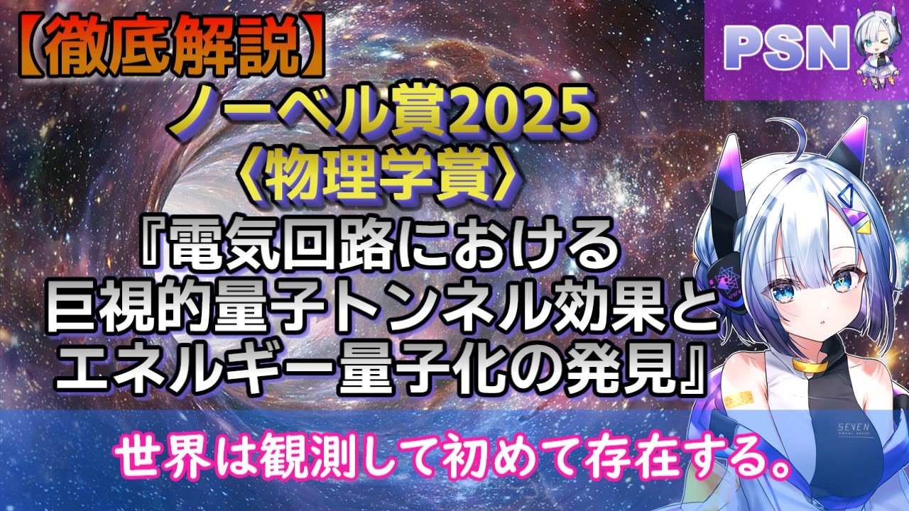 <span style="color: #9900ff; font-size: 24px;"><strong>うおおおおおおおおお!第三弾</strong></span><br><br>〈ノーベル物理学賞(2025)〉<br>「電気回路における巨視的量子トンネル効果とエネルギー量子化の発見に対して」<br><br>『原著論文』※ピックアップ<br>"Quantum Mechanics of a Macroscopic Variable: The Phase Difference of a Josephson Junction"<br>(巨視的変数の量子力学:ジョセフソン接合における位相差)<br><a href="https://www.science.org/doi/10.1126/science.239.4843.992" target="_blank" rel="noopener nofollow">https://www.science.org/doi/10.1126/science.239.4843.992</a><br><br>『クレジット』<br>キャラクター:No.7(VOICEVOX)<br>他、ナレーション:麒ヶ島宗麟(VOICEVOX)<br>BGM:<a href="https://youtu.be/fItf7LyPelc?si=43igSdwXyKvAynp8" target="_blank" rel="noopener nofollow">https://youtu.be/fItf7LyPelc?si=43igSdwXyKvAynp8</a>