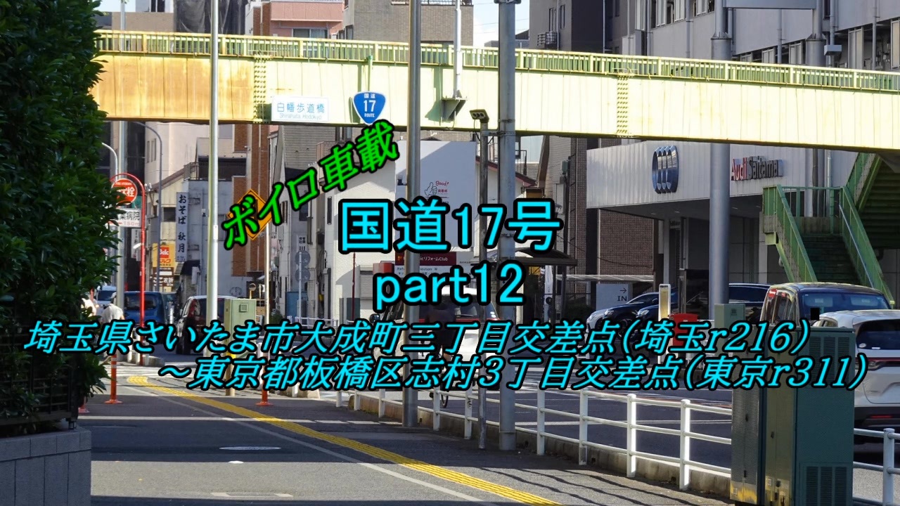 国道17号 走行の様子。<br>埼玉県さいたま市大成町三丁目交差点(埼玉r216)から東京都板橋区志村3丁目交差点(東京r311)まで。<br>走行年月 2024年10月 R463と接続、重複します。<br>さいたま市、蕨市、戸田市、板橋区の市街地をひたすら走ります。<br>首都高速道路や[C3]東京外環道と交差しますが、直接のインターはありません。<br>混雑気味のため、再生速度を上げております。<br>国道(<a href="https://www.nicovideo.jp/mylist/57923047" target="_blank" rel="noopener">mylist/57923047</a>)前(<a href="https://www.nicovideo.jp/watch/sm45532500" class="watch">sm45532500</a>)次(<a href="https://www.nicovideo.jp/watch/sm45602216" class="watch">sm45602216</a>)<br>※「東北ずん子」様によるナレーションがあります。<br>※動画広告ありがとうございます。「雪楓」さん「ほっしー」さん「よんよんぜろはち山」さん「HIROFUJI」さん「はいぱーあんくる」さん「ゆゆ埼い」さん「ゼルディア」さん「meekun046」さん「キノコマン」さん「みのて」さん「ほっしー」さん「片目の潰れた狸」さん「ひつじなべ」さん「副隊長」さん「彷徨う旅人」さん「これが男の引き際だぁぁぁぁぁぁぁ」さん