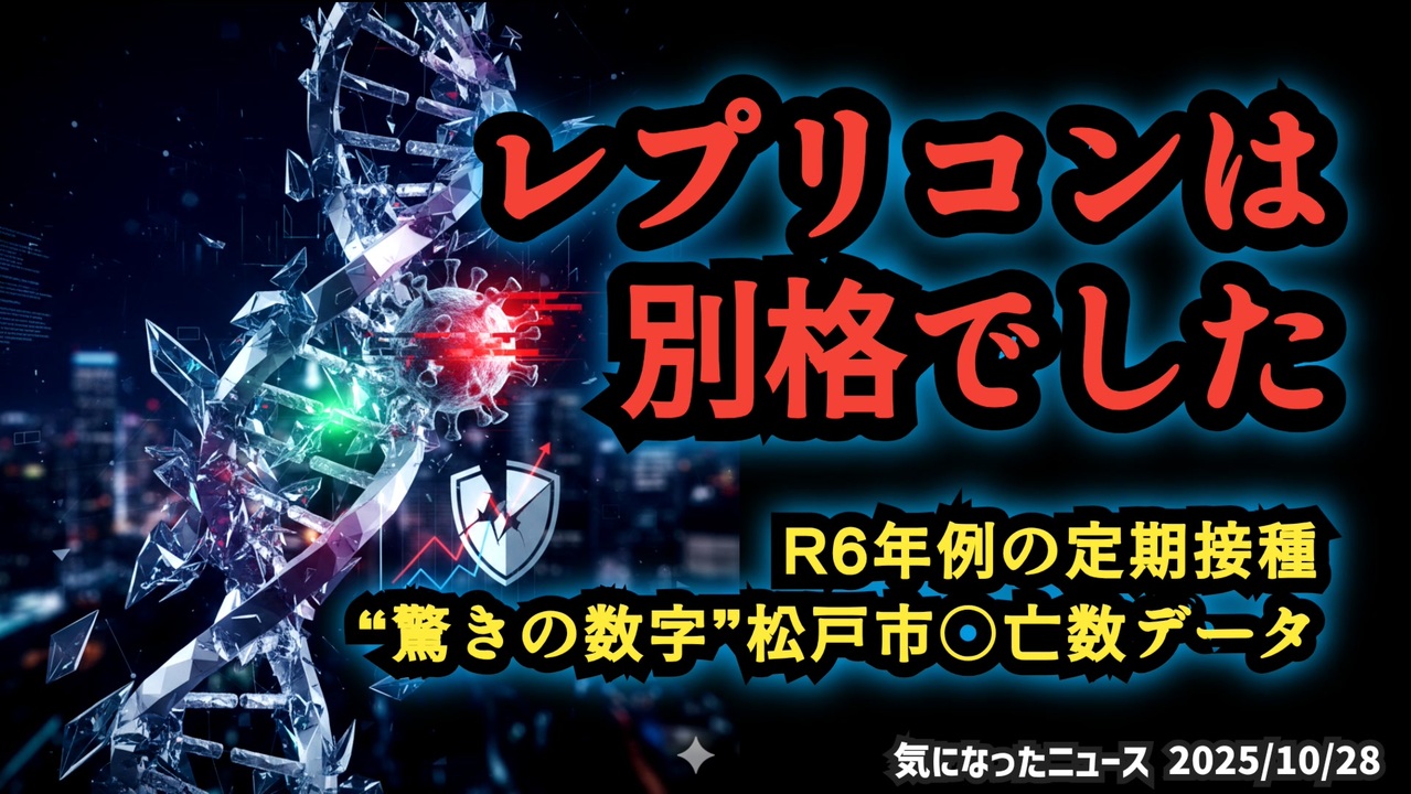 【レプリコンは別格レベル】◆松戸市データが示す驚きの差、65歳以上のコロナワクチン定期接種で何が起きているのか?レプリコンは別格松戸市データが示す“驚きの数字”あらすじ 2025年9月までに、千葉県松戸市で実施された令和6年度の新型コロナワクチン定期接種。対象は主に65歳以上で、総接種者は約2万4千人、そのうち761人が接種後に亡くなっています。製薬会社ごとの集計を見ると、死亡率には大きな差がありました。中でも注目を集めているのが、接種者数がわずか90人だった世界初承認された「ある製薬会社」のデータです。一体、何がその数字に影響したのか――。◆今回の台本(詳細)<a href="https://keiichiro8140.hatenablog.com/entry/25102999111" target="_blank" rel="noopener nofollow">https://keiichiro8140.hatenablog.com/entry/25102999111</a><br />著作権、肖像権に配慮して作成しております。<br><br>◆気になったニュースの台本!?<br>メモ代わりに作った台本をそのままあげてます<br><a href="https://keiichiro8140.hatenablog.com/." target="_blank" rel="noopener nofollow">https://keiichiro8140.hatenablog.com/.</a><br><br><br>ここからはシリーズ紹介<br><br><br>◆ ワクチン解毒・デトックス<br><a href="https://x.gd/fZweg" target="_blank" rel="noopener nofollow">https://x.gd/fZweg</a><br><br>◆ウイリアム・マキス博士のがん治療(イベルメクチン・フェンベンダゾール等)<br><a href="https://x.gd/AtFYS" target="_blank" rel="noopener nofollow">https://x.gd/AtFYS</a><br><br>◆予防接種健康被害救済制度<br><a href="https://x.gd/0xK9x" target="_blank" rel="noopener nofollow">https://x.gd/0xK9x</a><br><br>◆気になったニュース #1501~<br><br>◆ 【ショートver】気になったニュース<br><a href="https://x.gd/7MxXC" target="_blank" rel="noopener nofollow">https://x.gd/7MxXC</a><br><br>◆ 気になったニュース #1001~<br><a href="https://x.gd/Lp8gv" target="_blank" rel="noopener nofollow">https://x.gd/Lp8gv</a><br><br>◆ 気になったニュース #501~<br><a href="https://x.gd/EmbS4" target="_blank" rel="noopener nofollow">https://x.gd/EmbS4</a><br><br>◆ 気になったニュース #1~#500<br><a href="https://x.gd/uPhNb" target="_blank" rel="noopener nofollow">https://x.gd/uPhNb</a><br><br>◆ X(旧Twitter)・テレグラムで気になった情報<br><a href="https://x.gd/YG6FT" target="_blank" rel="noopener nofollow">https://x.gd/YG6FT</a><br><br>◆ 日比谷5万人パレードデ⚪生放送アーカイブ動画<br><a href="https://x.gd/3CHJv" target="_blank" rel="noopener nofollow">https://x.gd/3CHJv</a><br><br>◆日比谷5万人パレード⚪モのマイリスト作ってみました<br><a href="https://nico.ms/mylist/76828848?ref=sp_other" target="_blank" rel="noopener nofollow">https://nico.ms/mylist/76828848?ref=sp_other</a><br><br>◆3.30 令和の百姓⚪⚪<br><a href="https://www.nicovideo.jp/series/511791?ref=garage_share_other" target="_blank" rel="noopener nofollow">https://www.nicovideo.jp/series/511791?ref=garage_share_other</a><br><br>◆ 及川幸久さんの【XNEWS】シリーズ<br><a href="https://x.gd/3k78K" target="_blank" rel="noopener nofollow">https://x.gd/3k78K</a><br><br>◆これまでの動画<a href="https://x.gd/sPXoJ" target="_blank" rel="noopener nofollow">https://x.gd/sPXoJ</a><br><br>◆もしも(BAN)の時のためのマイリンク集<a href="https://lit.link/K-16_News44" target="_blank" rel="noopener nofollow">https://lit.link/K-16_News44</a><br><br>