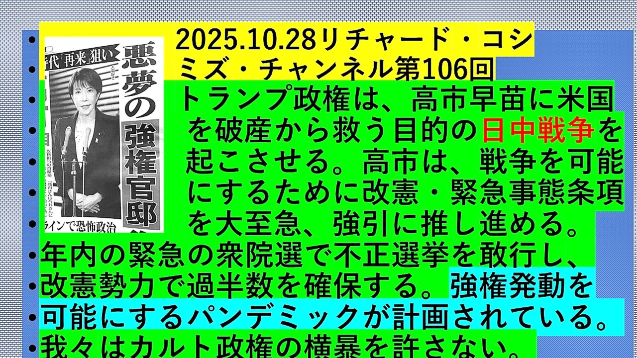 <span style="color: #cc0000;"><strong>◐『「 リチャード・コシミズ・チャンネル 」⦅ 第106回放送 ⦆⦅ 改良版 ⦆』</strong></span><br><br> <span style="color: #ff0000;"><strong>「『 トランプ政権 』は、『 高市早苗 』に『 米国 』を『 破産 』から『 救う 』目的の『 日中戦争 』を『 起こさせる 』。『 高市 』は、『 戦争 』を<br> 『 可能 』にするために『 改憲 』・『 緊急事態条項 』を『 大至急 』、『 強引 』に『 推し進める 』。『 年内 』の『 緊急 』の『 衆院選 』で『 不正<br> 選挙 』を『 敢行 』し、『 改憲勢力 』で『 過半数 』を『 確保 』する。『 強権発動 』を『 可能 』にする『 パンデミック 』が『 計画 』されている。<br> 『 我々 』は、『 カルト政権 』の『 横暴 』を『 許さない 』」</strong></span><br><br> <span style="color: #38761d;"><strong>◐『 リチャード・コシミズ・チャンネル</strong></span><span style="color: #ff0000;"><strong>⦅ ニコニコ チャンネル ⦆</strong></span><span style="color: #38761d;"><strong>』</strong></span><br> <span style="color: #0000ff;"><strong><a href="https://ch.nicovideo.jp/richardkoshimizu" target="_blank" rel="noopener nofollow">https://ch.nicovideo.jp/richardkoshimizu</a></strong></span><br><br> <span style="color: #38761d;"><strong>◐『 リチャード・コシミズ</strong></span><span style="color: #ff0000;"><strong>「 ニコニコ生放送⦅ LIVE ⦆」</strong></span><span style="color: #38761d;"><strong>』</strong></span><br> <span style="color: #0000ff;"><strong><a href="https://www.nicovideo.jp/user/120930363/live_programs" target="_blank" rel="noopener nofollow">https://www.nicovideo.jp/user/120930363/live_programs</a></strong></span><br><br>