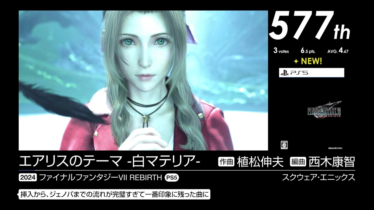 598位~577位の25曲を収録。<br><br>2024年6月11日~2024年8月1日で行われた「第17回みんなで決めるゲーム音楽ベスト100」の投票結果動画です。集計人≠動画制作者<br>公式歌詞をください。<br><br><a href="https://www.nicovideo.jp/watch/sm45551666" class="watch">sm45551666</a>←前 次→<a href="https://www.nicovideo.jp/watch/sm45601100" class="watch">sm45601100</a><br><a href="https://www.nicovideo.jp/mylist/78315745" target="_blank" rel="noopener">mylist/78315745</a> <a href="https://www.nicovideo.jp/series/523562" target="_blank" rel="noopener">series/523562</a><br><br>598位 <a href="#" class="seekTime" data-seekTime="0:40" onclick="seekNicoPlayer('#0:40'); return false;">#0:40</a>, <a href="#" class="seekTime" data-seekTime="2:38" onclick="seekNicoPlayer('#2:38'); return false;">#2:38</a>, <a href="#" class="seekTime" data-seekTime="7:11" onclick="seekNicoPlayer('#7:11'); return false;">#7:11</a>, <a href="#" class="seekTime" data-seekTime="10:14" onclick="seekNicoPlayer('#10:14'); return false;">#10:14</a> / 592位 <a href="#" class="seekTime" data-seekTime="16:03" onclick="seekNicoPlayer('#16:03'); return false;">#16:03</a>, <a href="#" class="seekTime" data-seekTime="17:46" onclick="seekNicoPlayer('#17:46'); return false;">#17:46</a>, <a href="#" class="seekTime" data-seekTime="21:10" onclick="seekNicoPlayer('#21:10'); return false;">#21:10</a>, <a href="#" class="seekTime" data-seekTime="28:49" onclick="seekNicoPlayer('#28:49'); return false;">#28:49</a>, <a href="#" class="seekTime" data-seekTime="34:05" onclick="seekNicoPlayer('#34:05'); return false;">#34:05</a>, <a href="#" class="seekTime" data-seekTime="40:47" onclick="seekNicoPlayer('#40:47'); return false;">#40:47</a> / 587位 <a href="#" class="seekTime" data-seekTime="44:17" onclick="seekNicoPlayer('#44:17'); return false;">#44:17</a>, <a href="#" class="seekTime" data-seekTime="45:58" onclick="seekNicoPlayer('#45:58'); return false;">#45:58</a>, <a href="#" class="seekTime" data-seekTime="49:00" onclick="seekNicoPlayer('#49:00'); return false;">#49:00</a>, <a href="#" class="seekTime" data-seekTime="53:34" onclick="seekNicoPlayer('#53:34'); return false;">#53:34</a>, <a href="#" class="seekTime" data-seekTime="56:25" onclick="seekNicoPlayer('#56:25'); return false;">#56:25</a> / 583位 <a href="#" class="seekTime" data-seekTime="61:04" onclick="seekNicoPlayer('#61:04'); return false;">#61:04</a>, <a href="#" class="seekTime" data-seekTime="66:07" onclick="seekNicoPlayer('#66:07'); return false;">#66:07</a>, <a href="#" class="seekTime" data-seekTime="69:20" onclick="seekNicoPlayer('#69:20'); return false;">#69:20</a>, <a href="#" class="seekTime" data-seekTime="72:46" onclick="seekNicoPlayer('#72:46'); return false;">#72:46</a> / 582位 <a href="#" class="seekTime" data-seekTime="76:04" onclick="seekNicoPlayer('#76:04'); return false;">#76:04</a> / 580位 <a href="#" class="seekTime" data-seekTime="78:44" onclick="seekNicoPlayer('#78:44'); return false;">#78:44</a>, <a href="#" class="seekTime" data-seekTime="82:15" onclick="seekNicoPlayer('#82:15'); return false;">#82:15</a> / 579位 <a href="#" class="seekTime" data-seekTime="85:13" onclick="seekNicoPlayer('#85:13'); return false;">#85:13</a> / 578位 <a href="#" class="seekTime" data-seekTime="88:24" onclick="seekNicoPlayer('#88:24'); return false;">#88:24</a> / 577位 <a href="#" class="seekTime" data-seekTime="91:39" onclick="seekNicoPlayer('#91:39'); return false;">#91:39</a><br><br>----------<br><br>スクリーンショット募集中!詳細はこちら↓<br><a href="https://gamemusic17.vercel.app/" target="_blank" rel="noopener nofollow">https://gamemusic17.vercel.app/</a><br><br>結果詳細↓<br><a href="https://w.atwiki.jp/gamemusicbest100/pages/10538.html" target="_blank" rel="noopener nofollow">https://w.atwiki.jp/gamemusicbest100/pages/10538.html</a><br /><br>----------<br><br>第2回みんなで決める和風曲ランキング 2/28まで投票受付中!<br><a href="https://jbbs.shitaraba.net/bbs/read.cgi/music/25545/1764514793/" target="_blank" rel="noopener nofollow">https://jbbs.shitaraba.net/bbs/read.cgi/music/25545/1764514793/</a><br><br>みんなで決める2025年の新曲ゲーム音楽ランキング 3/31まで投票受付中!<br><a href="https://jbbs.shitaraba.net/bbs/read.cgi/music/25545/1769870472/" target="_blank" rel="noopener nofollow">https://jbbs.shitaraba.net/bbs/read.cgi/music/25545/1769870472/</a>