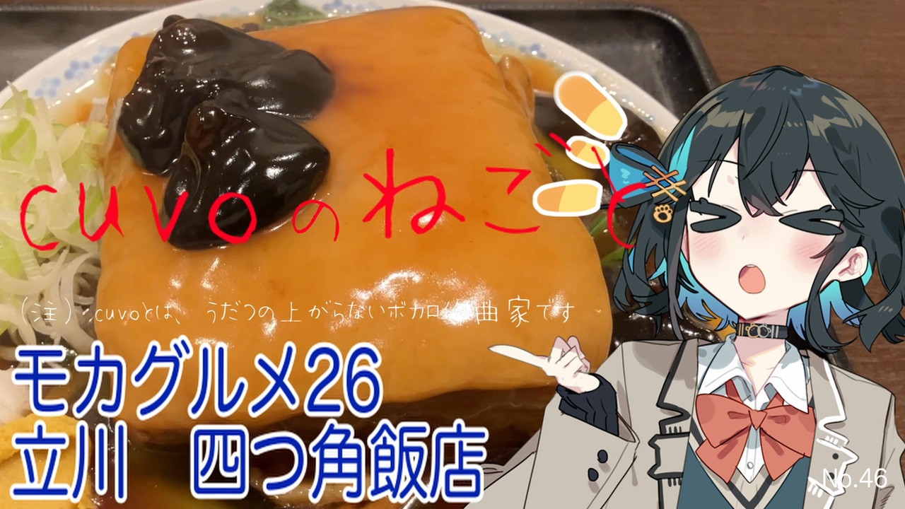 こんにちは!<br>cuvoのねごと、第46回です!<br><br>シリーズ「モカグルメ」の<br>第26弾をお届けします!<br><br>今回は立川にある<br>四つ角飯店に行ってきました<br><br>ボリューミーな角煮を頂きましたよー<br>美味しかったです!<br><br>「これが至福ってやつですかぁ!」<br><br>気になった方は、ぜひ行ってみてくださいね!<br><br>ーーーーーーーー<br><strong>立川まで箱根駅伝の予選会をロケしに行った曲はこちら!!<br>ぜひ、聞いていてください♪<br><br>「途切れないメロディ」<br><br>↓YouTube<br><a href="https://youtu.be/tge1vsuUg2w" target="_blank" rel="noopener nofollow">https://youtu.be/tge1vsuUg2w</a><br><br>↓ニコ動<br><a href="https://www.nicovideo.jp/watch/sm45533201" target="_blank" rel="noopener nofollow">https://www.nicovideo.jp/watch/sm45533201</a><br><br>Music Lyrics Photography Production<br>cuvo<br><br>Vocal<br>宮舞モカ</strong><br><br>ーーーーーーー<br>▼Xで発信中!cuvoのねごと<br><a href="https://twitter.com/cuvo_jpn" target="_blank" rel="noopener nofollow">https://twitter.com/cuvo_jpn</a><br><br><br>▼エンディングテーマ<br>「飲みに行こう」<br>曲:cuvo / 詞:vie<br>歌:seven(neutrino)<br><br>↓ニコ動<br><a href="https://nico.ms/sm41946436" target="_blank" rel="noopener nofollow">https://nico.ms/sm41946436</a><br><br>↓YouTube<br><a href="https://youtu.be/aJWyRuT7cGk" target="_blank" rel="noopener nofollow">https://youtu.be/aJWyRuT7cGk</a><br><br>ーーーーーーーーーーーーーーーーー<br><br />ニコニコ動画(cuvo:ボカロ曲)<br><a href="https://www.nicovideo.jp/user/123099454/video" target="_blank" rel="noopener nofollow">https://www.nicovideo.jp/user/123099454/video</a><br><br>YouTube<br><a href="https://www.youtube.com/channel/UCeyFWGAsM1u0r7XpT0yeDPA/" target="_blank" rel="noopener nofollow">https://www.youtube.com/channel/UCeyFWGAsM1u0r7XpT0yeDPA/</a><br><br>X(旧Twitter)<br><a href="https://twitter.com/cuvo_jpn" target="_blank" rel="noopener nofollow">https://twitter.com/cuvo_jpn</a><br><br>Instagram<br><a href="https://www.instagram.com/cuvo_jpn/" target="_blank" rel="noopener nofollow">https://www.instagram.com/cuvo_jpn/</a>